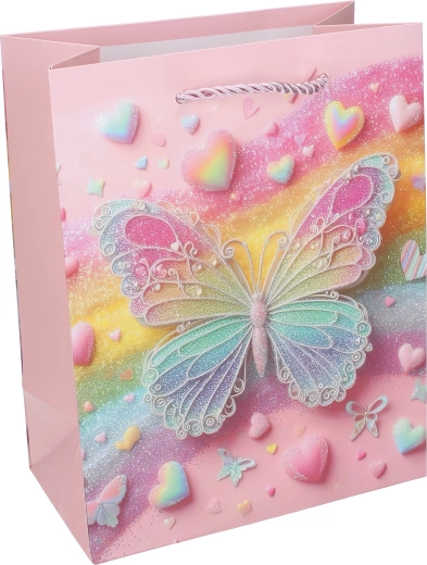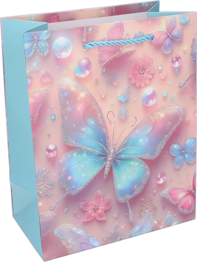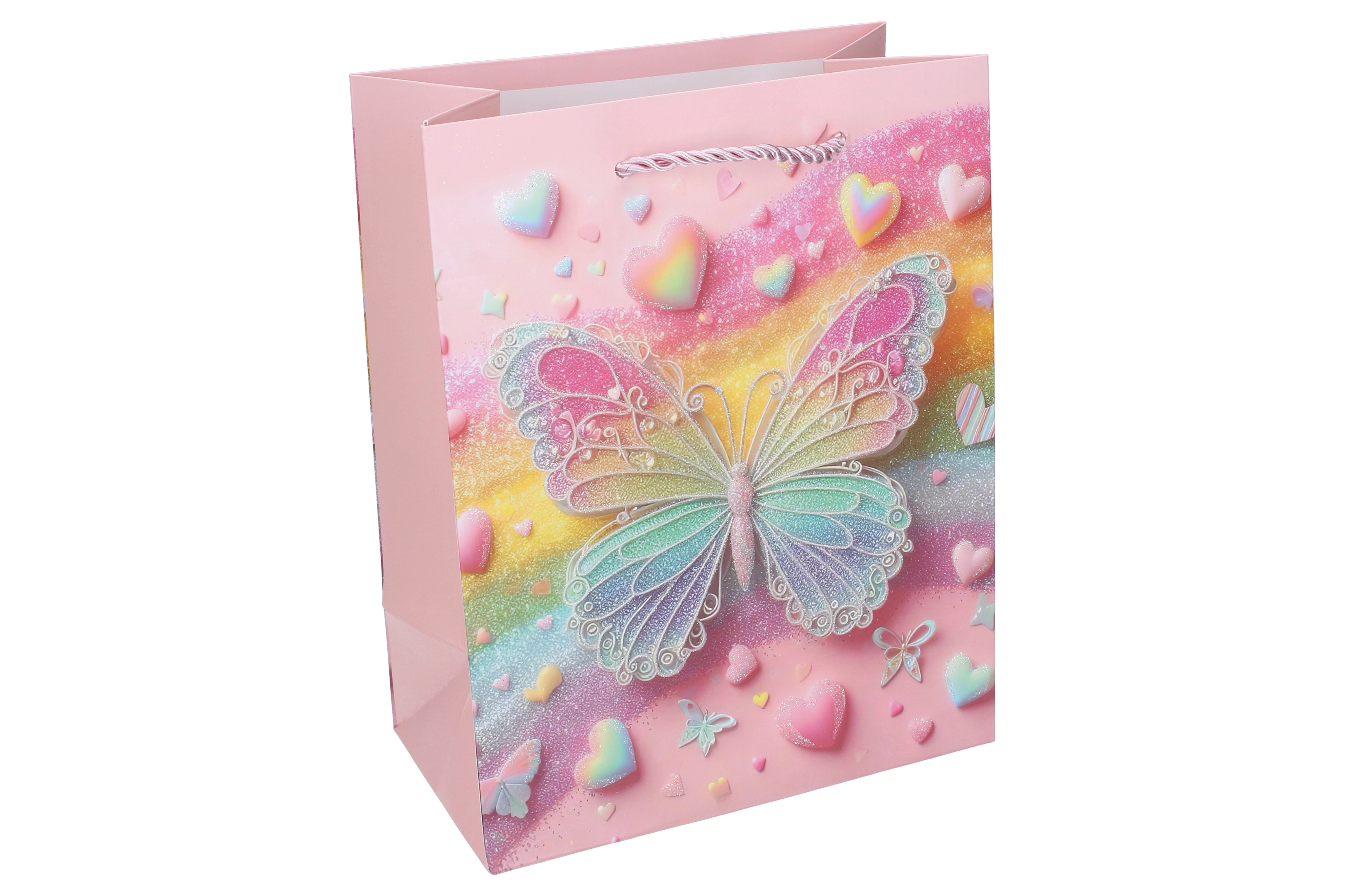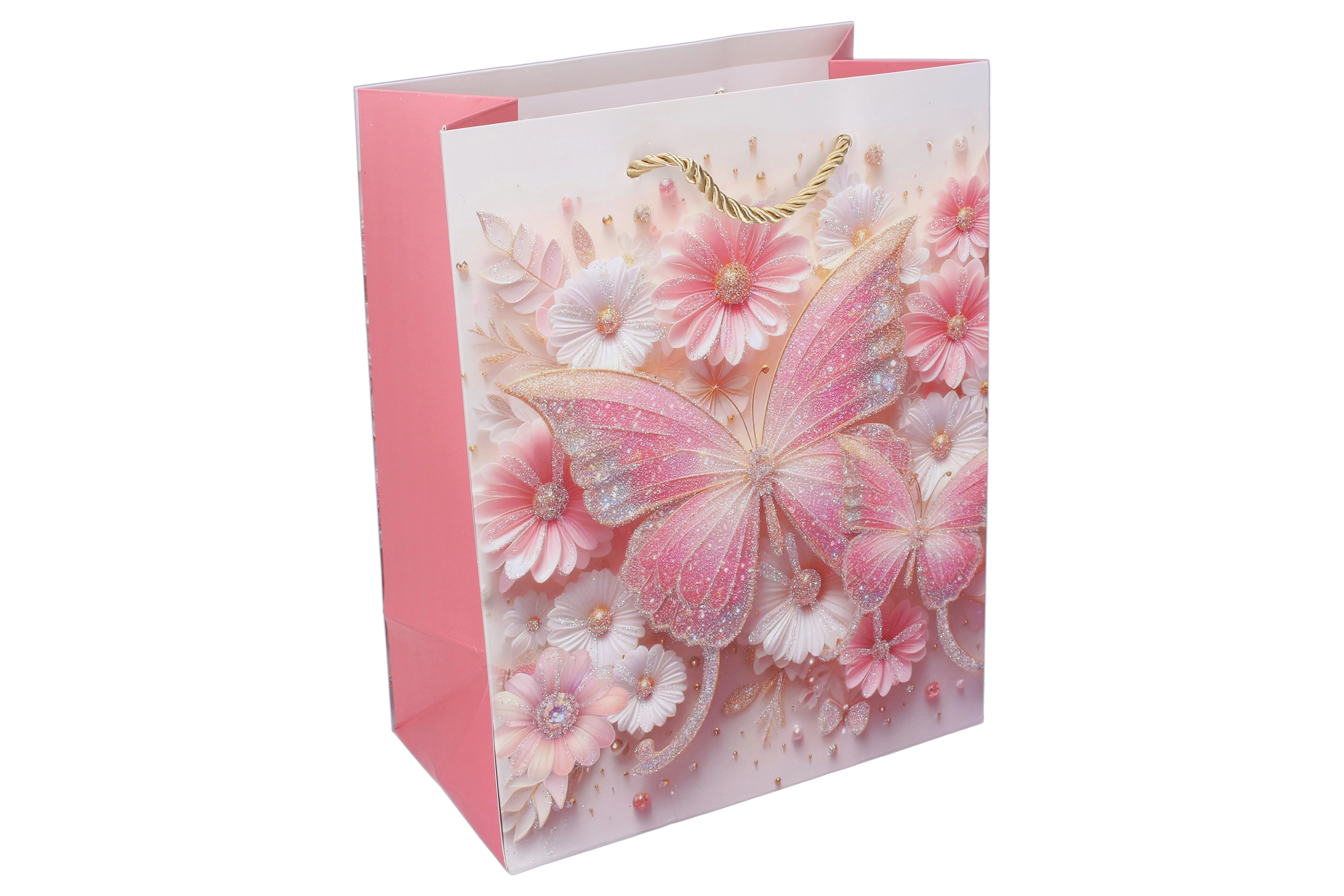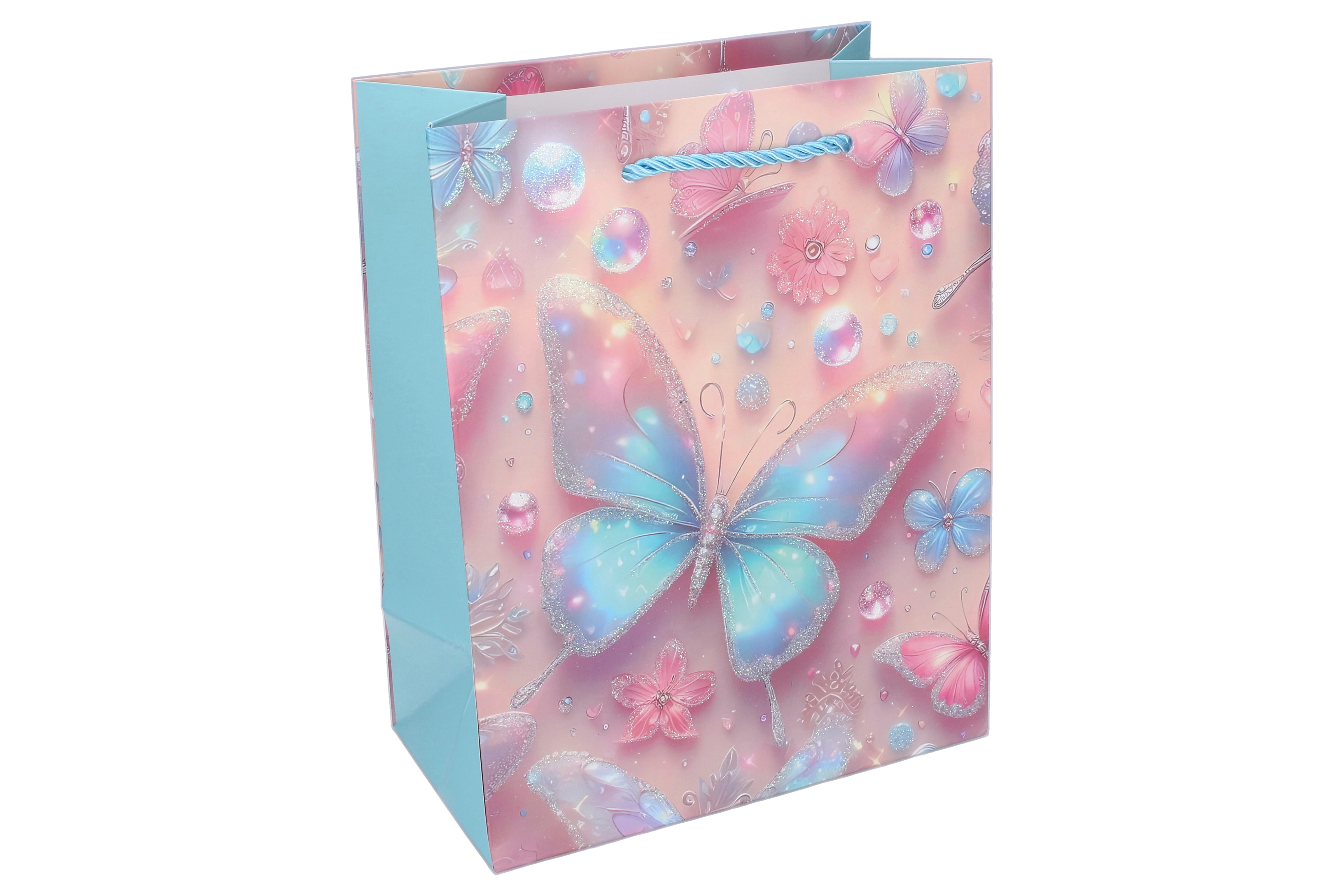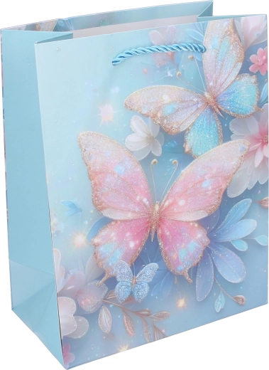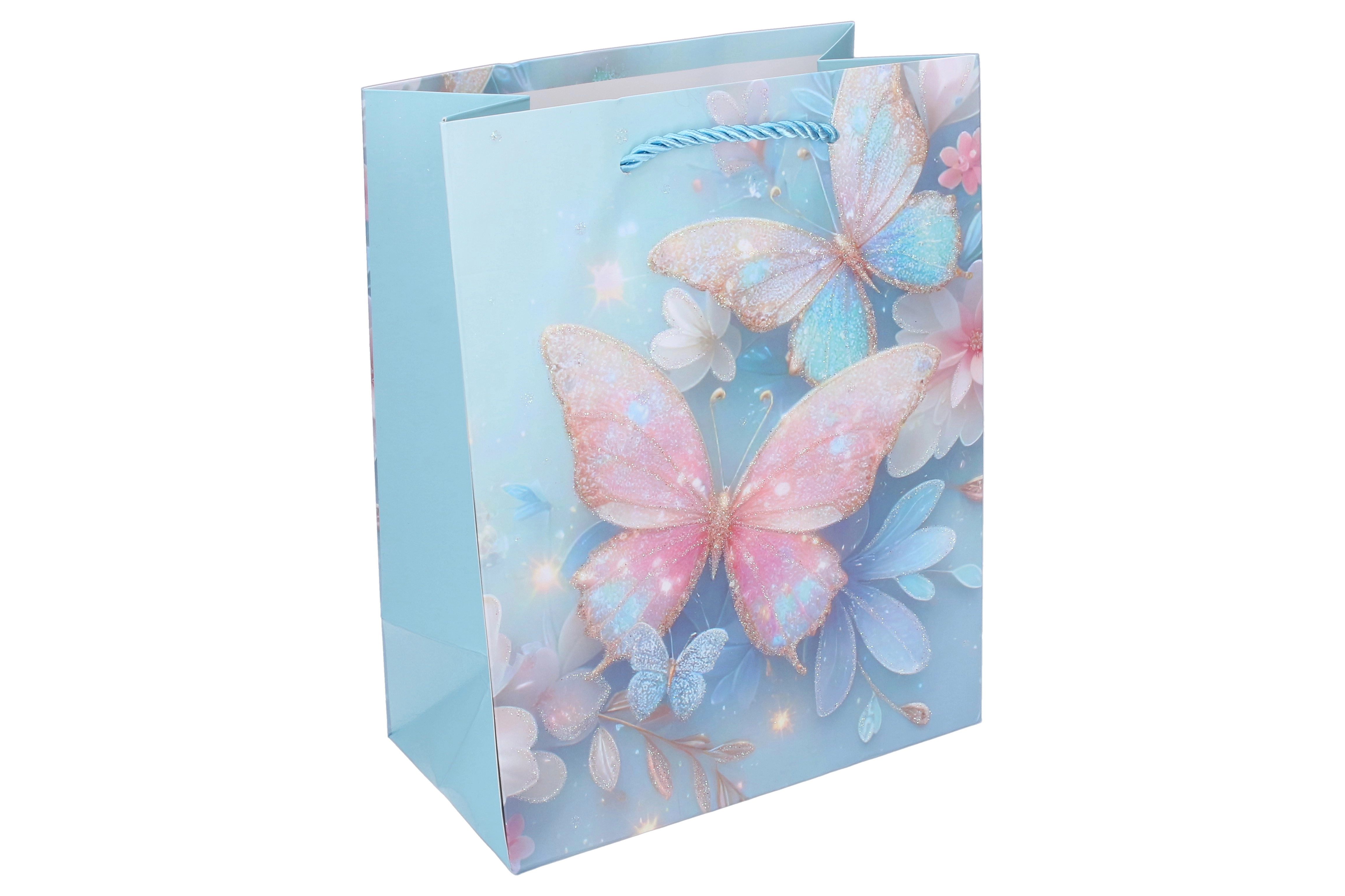 Ta torebka prezentowa z uroczym motywem motyli zamieni każdy podarunek w efektowną niespodziankę. Wyróżnia się mocnymi sznurkowymi uchwytami, wzmocnionymi krawędziami oraz wysokiej jakości papierem, co zapewnia niezawodne noszenie i piękną prezentację.