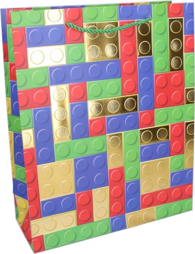Szukasz oryginalnego i wytrzymałego opakowania prezentu dla dzieci? Ta torebka prezentowa z motywem kolorowych klocków przyciąga wzrok od pierwszego spojrzenia. Średni rozmiar M (26 × 32 × 10 cm) bez trudu pomieści książki, zabawki, drobną elektronikę czy kreatywne zestawy.