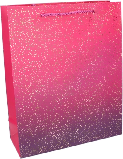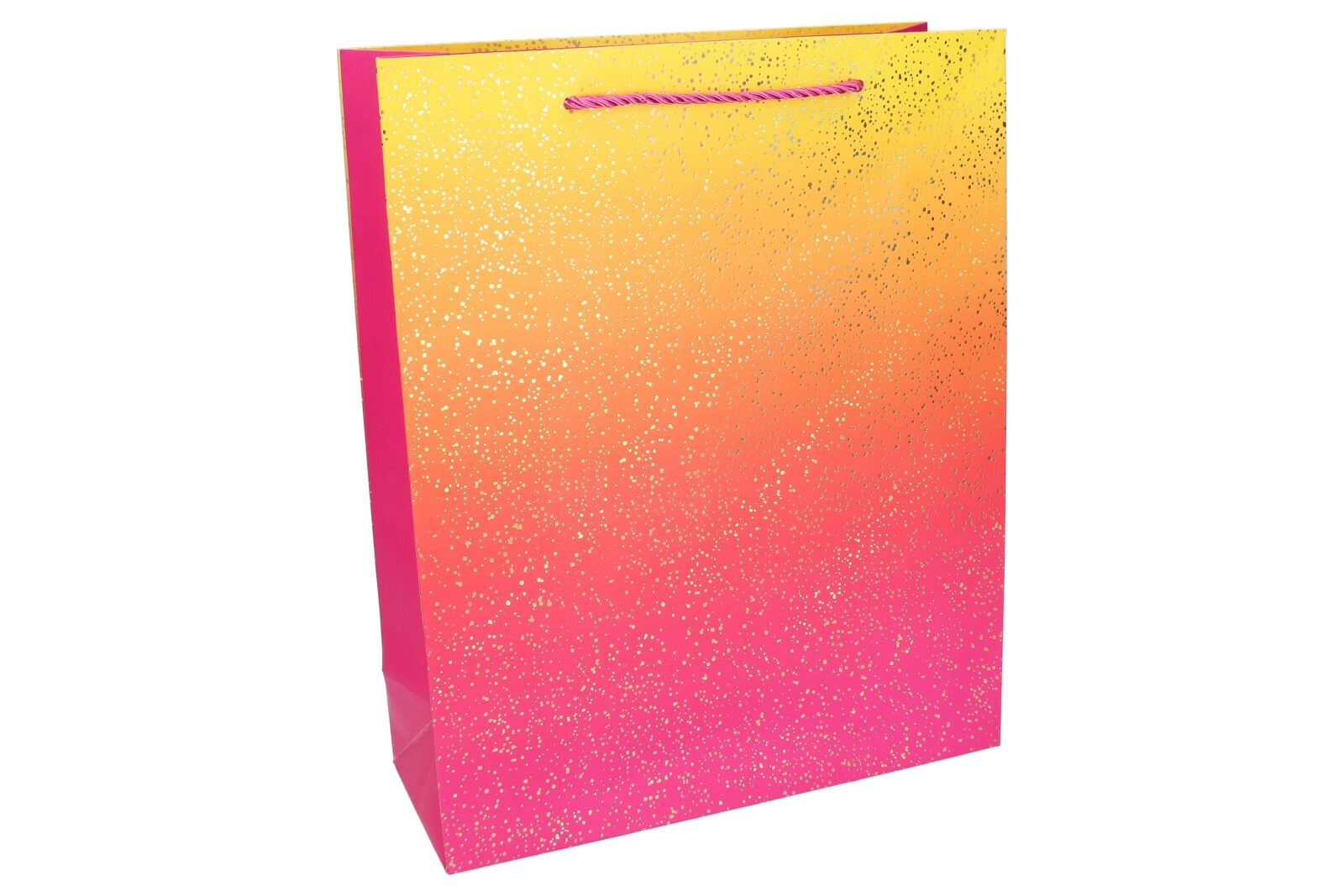 Ta duża torebka prezentowa z wysokiej jakości papieru zachwyca nowoczesnym ombre/gradientowym wyglądem w połączeniu z metalicznymi złotymi akcentami, które dodają Twojemu prezentowi odświętnego charakteru. Dzięki wymiarom 31 × 42 × 12 cm wygodnie pomieści bardziej objęte przedmioty, pudełka z prezentami, odzież czy zestawy kosmetyków.