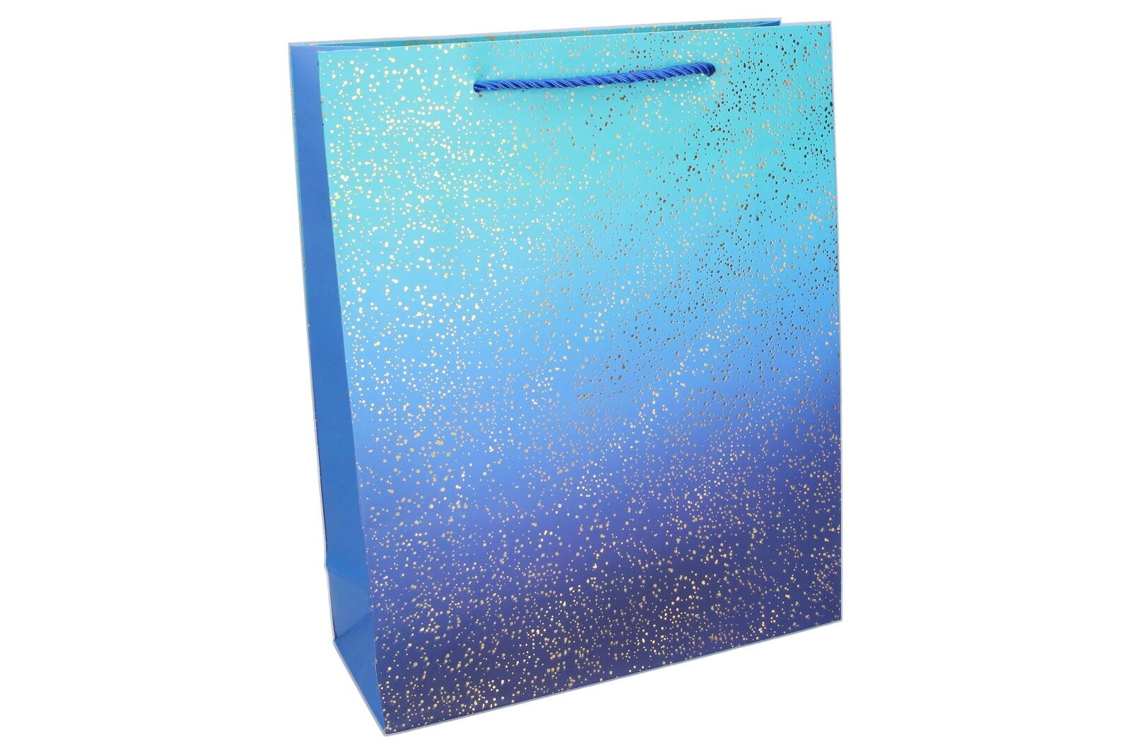 Ta torebka prezentowa doda Twojemu podarunkowi natychmiastowego szyku. Błyszczący gradient kolorów z delikatnymi złotymi kropkami wygląda odświętnie, a jednocześnie uniwersalnie – sprawdzi się na urodziny, święta, wesela i prezenty firmowe. Dzięki kompaktowym wymiarom S z łatwością pomieści kosmetyki, drobne akcesoria, świece, książki czy mniejsze butelki.