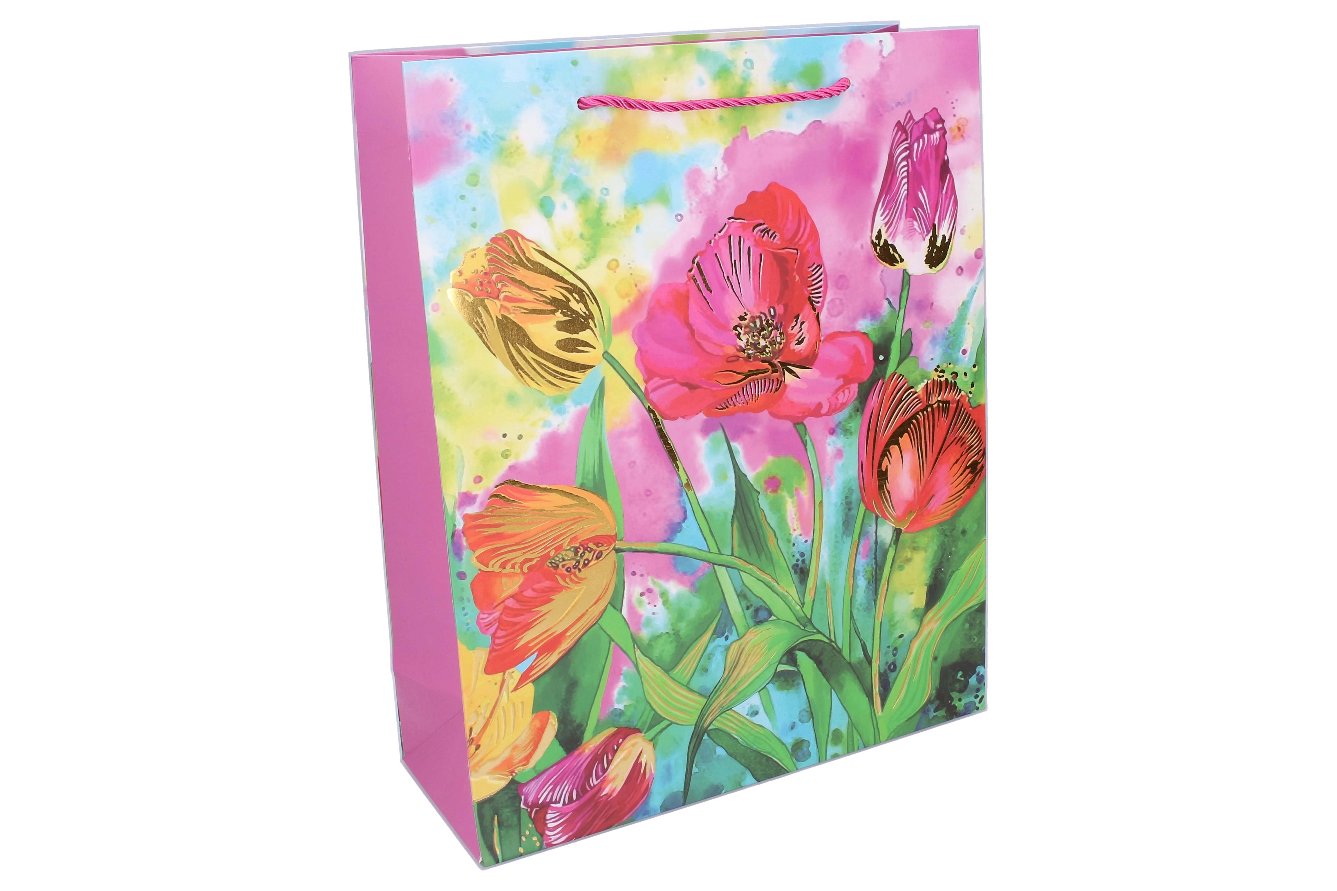 Wyrazisty nadruk z kwiatami w odcieniach różu, fioletu i niebieskiego nada każdemu prezentowi elegancki wygląd i odświętny charakter.