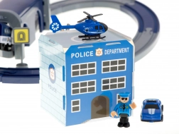 Stacja policyjna z lądowiskiem, 4 różne pojazdy, helikopter, figurka policjanta i znaki drogowe – wszystko do realistycznych akcji i nauki zasad ruchu drogowego.