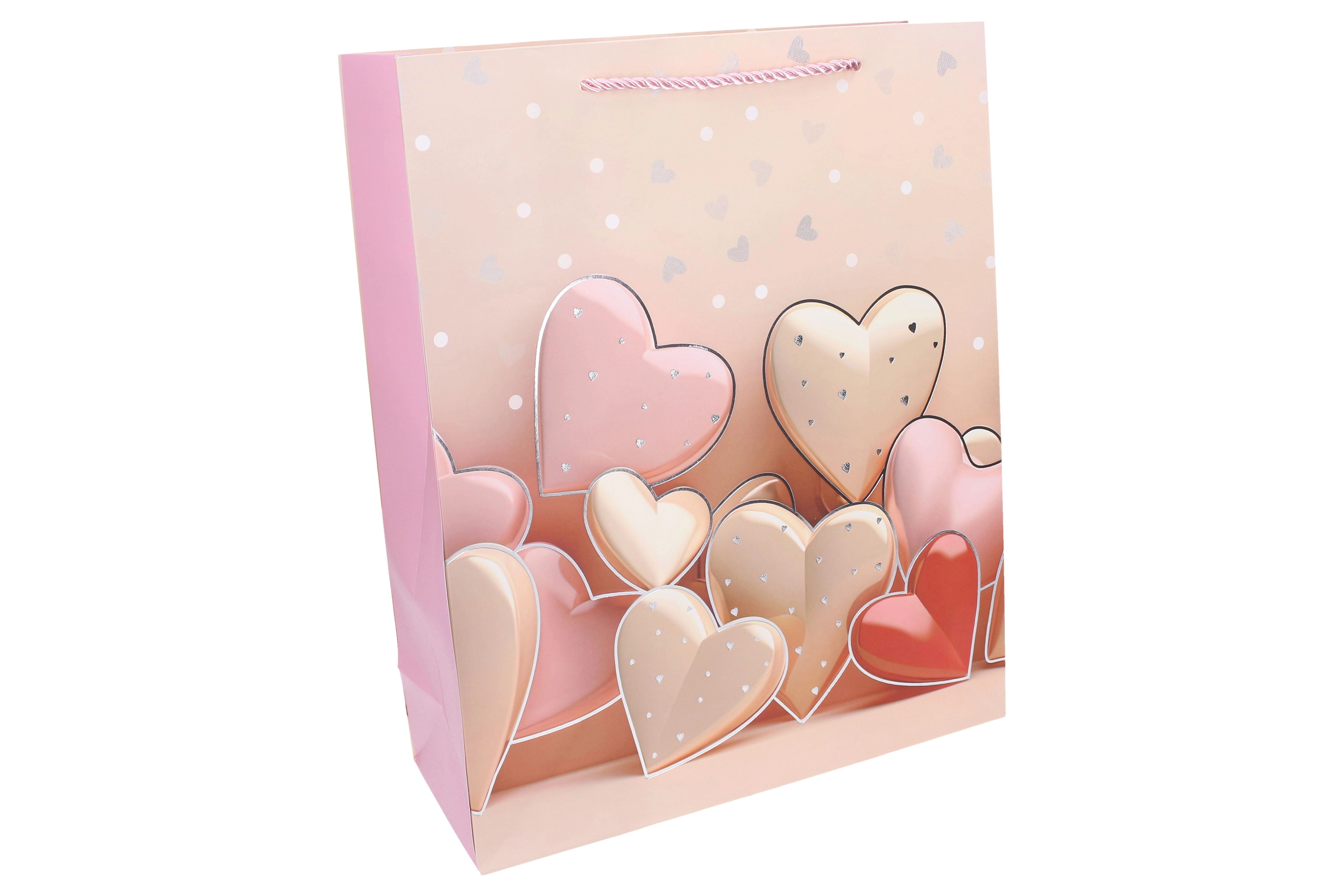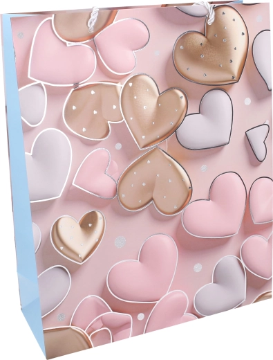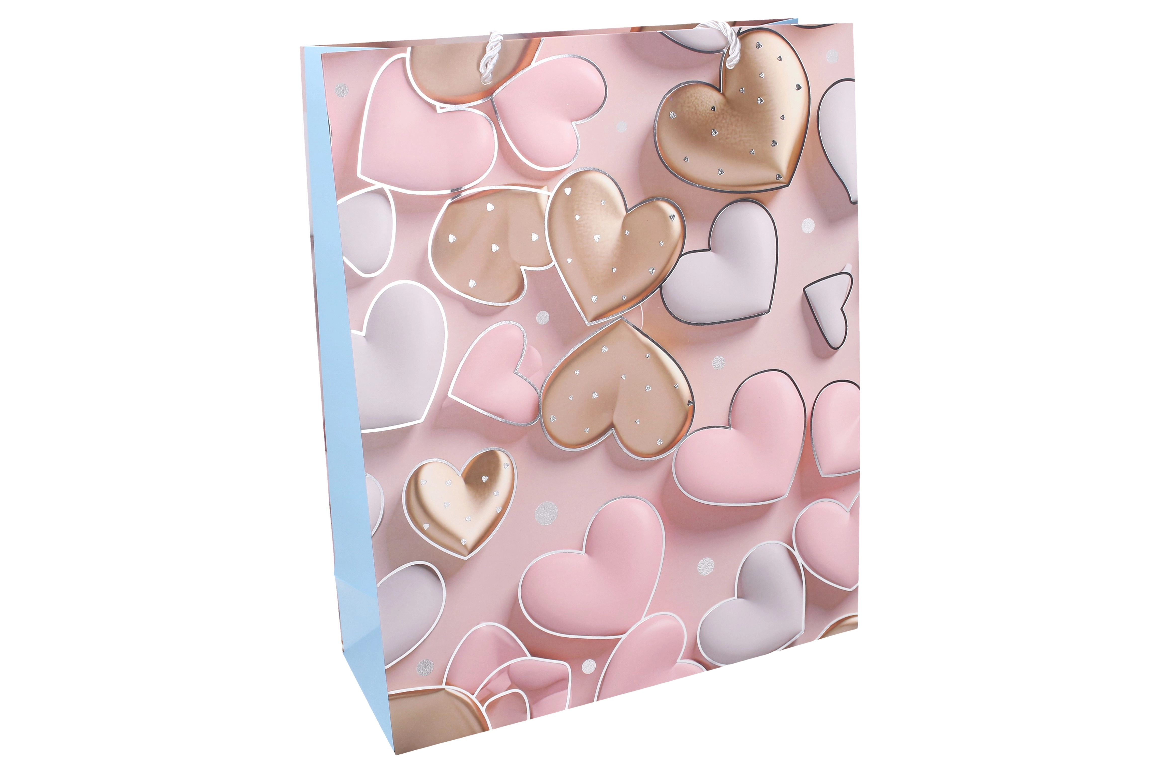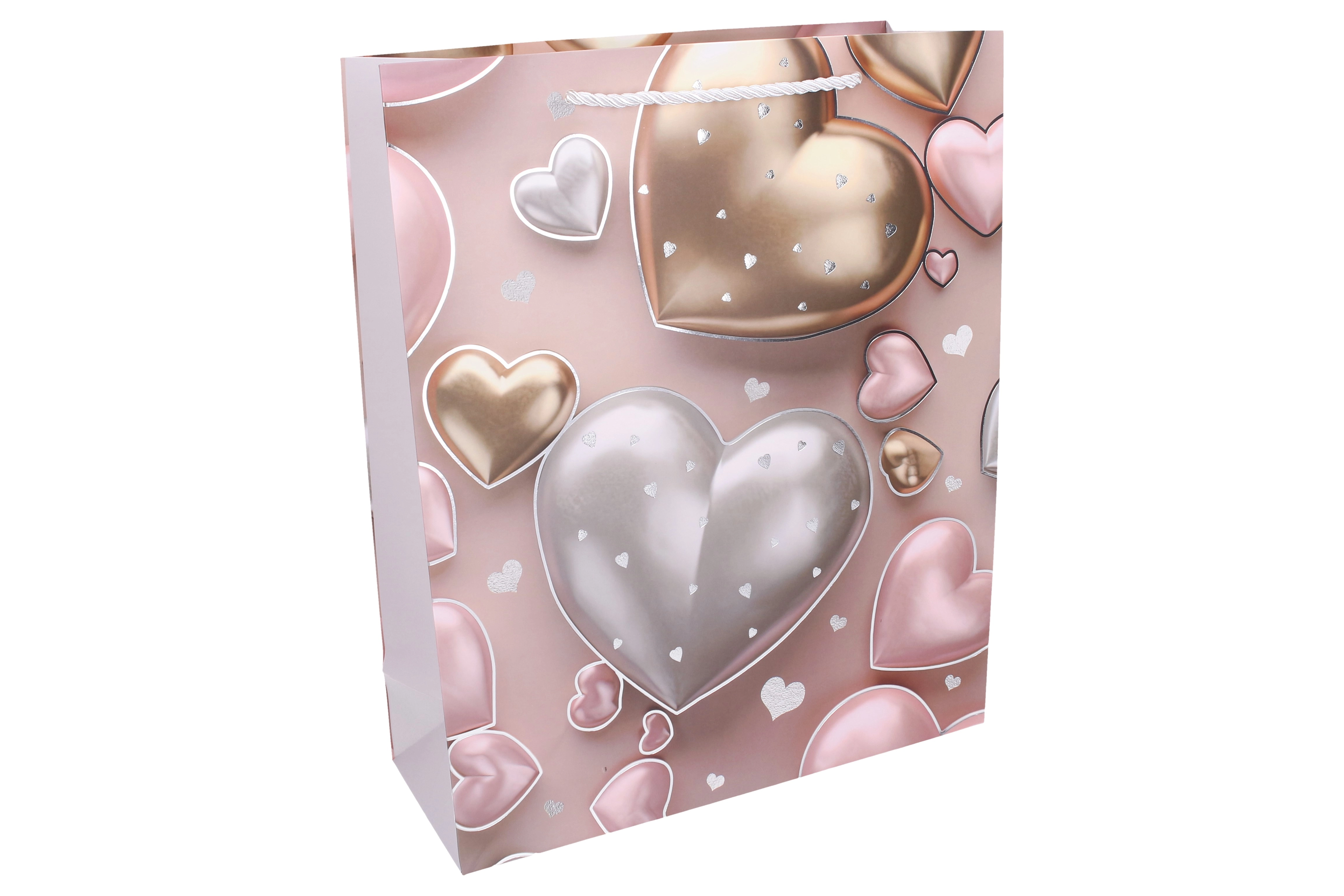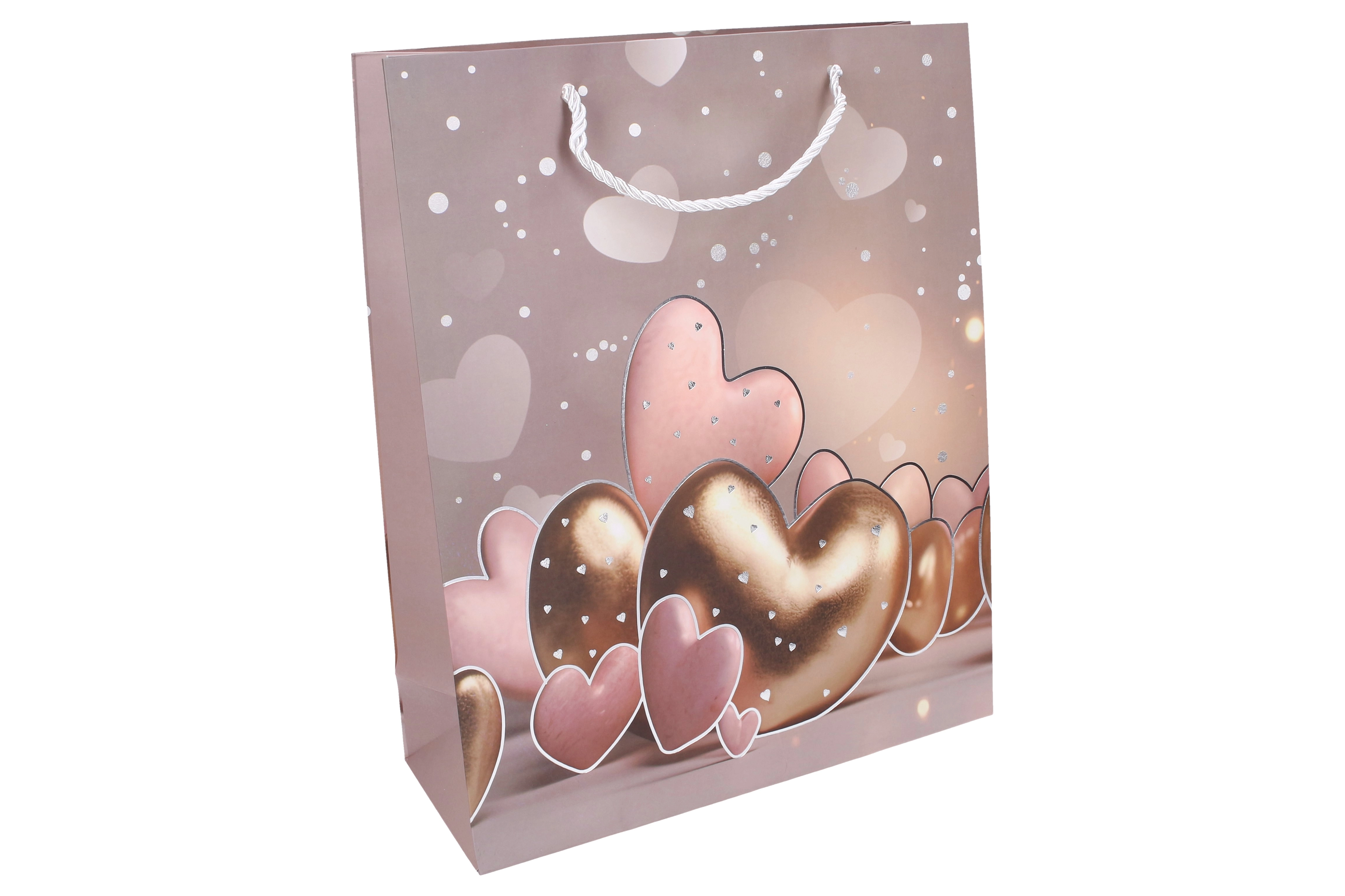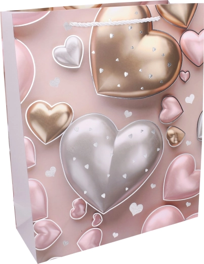 Elegancka torebka prezentowa z motywem serca nada Twojemu podarunkowi wyjątkowy styl. Dzięki przestronnym wymiarom L z łatwością pomieści książki, ubrania, zestawy kosmetyczne czy dekoracje. Całoroczny design sprawdzi się na urodziny, święta, rocznice i podziękowania.