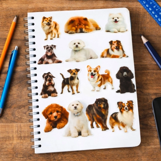 Po przyklejeniu widoczny jest wyłącznie motyw psa — bez rozpraszającej białej obwódki. Idealne do kolorowych zeszytów, okładek i kreatywnych projektów.