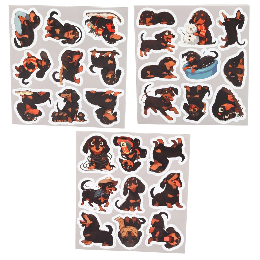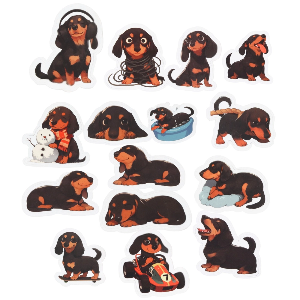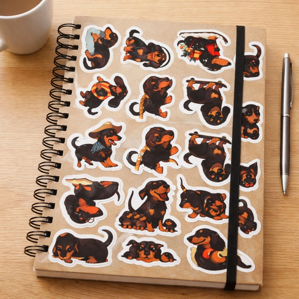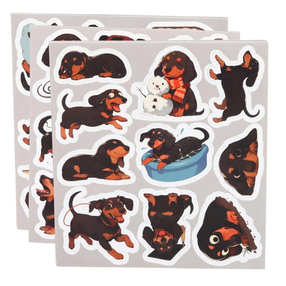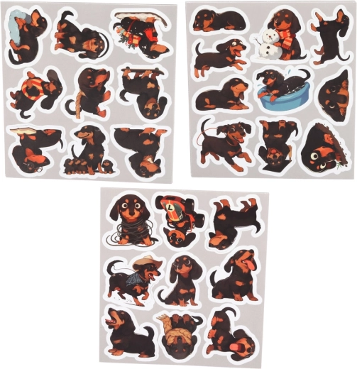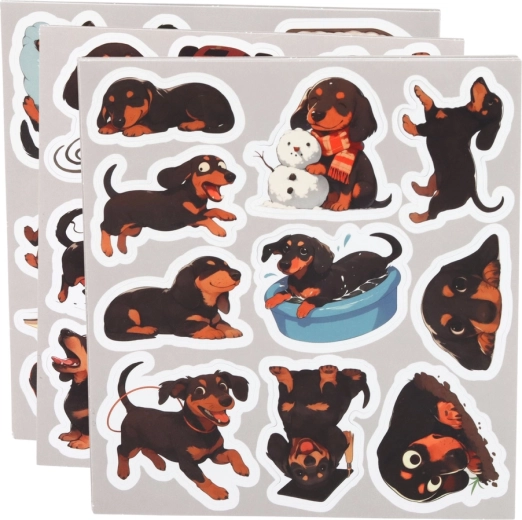 Uroczy zestaw naklejek z motywem jamników oferuje 54 różne wzory do ozdabiania zeszytów, pamiętników, planerów i prezentów. Każda naklejka przedstawia jamnika w innej pozie, dzięki czemu z łatwością stworzysz oryginalne kompozycje. Naklejki są łatwe do odklejenia i dobrze przylegają, mają praktyczny rozmiar ok. 5–6 cm i świetnie trzymają się na gładkich powierzchniach.