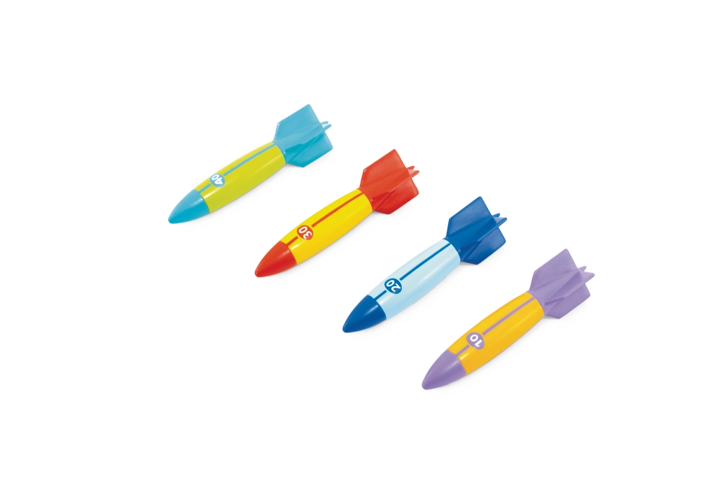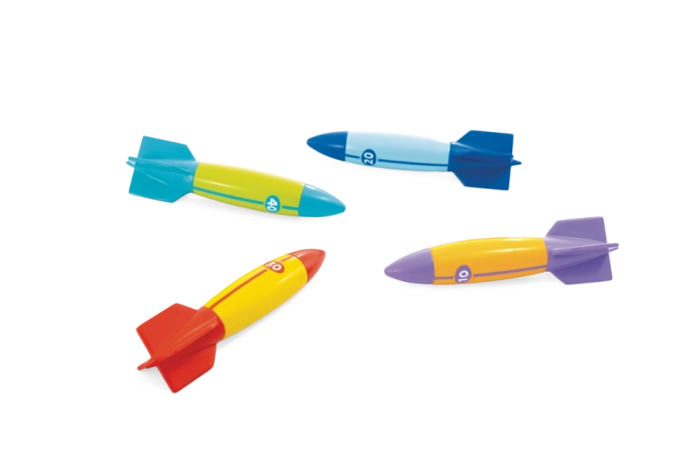 Zabawny zestaw czterech nurkujących torped dla dzieci od 6 lat zapewnia pełne akcji zabawy w basenie. Torpedy o aerodynamicznym kształcie płynnie suną pod wodą na odległość do 6 m i mają kolorowe oznaczenia z wartościami punktowymi do rywalizacyjnych gier. Wykonane z miękkiego, a jednocześnie wytrzymałego materiału dla bezpiecznego użytkowania, z statecznikami dla pewnego chwytu i precyzyjnego rzutu. Idealne do treningu oddychania, nurkowania i koordynacji. Bezpieczna miękka konstrukcja, płynny ślizg do 6 m, jasne kolory i oznaczenia punktowe.