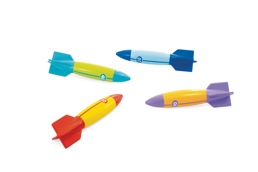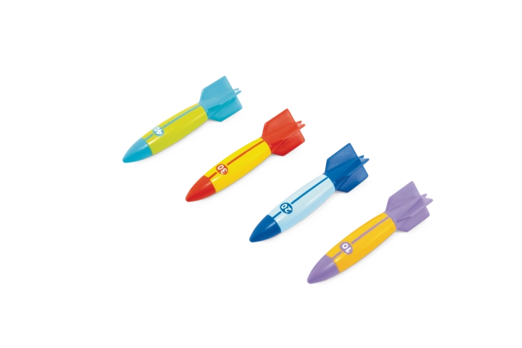 Każda torpeda ma wyraziste kolory i oznaczenia liczbowe (10/20/30/40) dla łatwego rozróżniania i punktacji. Stabilizujące stateczniki ułatwiają chwyt i kontrolę kierunku, dzięki czemu dzieci osiągają dłuższe i dokładniejsze rzuty pod wodą – świetne do zawodów z przyjaciółmi w basenie lub na kąpielisku.