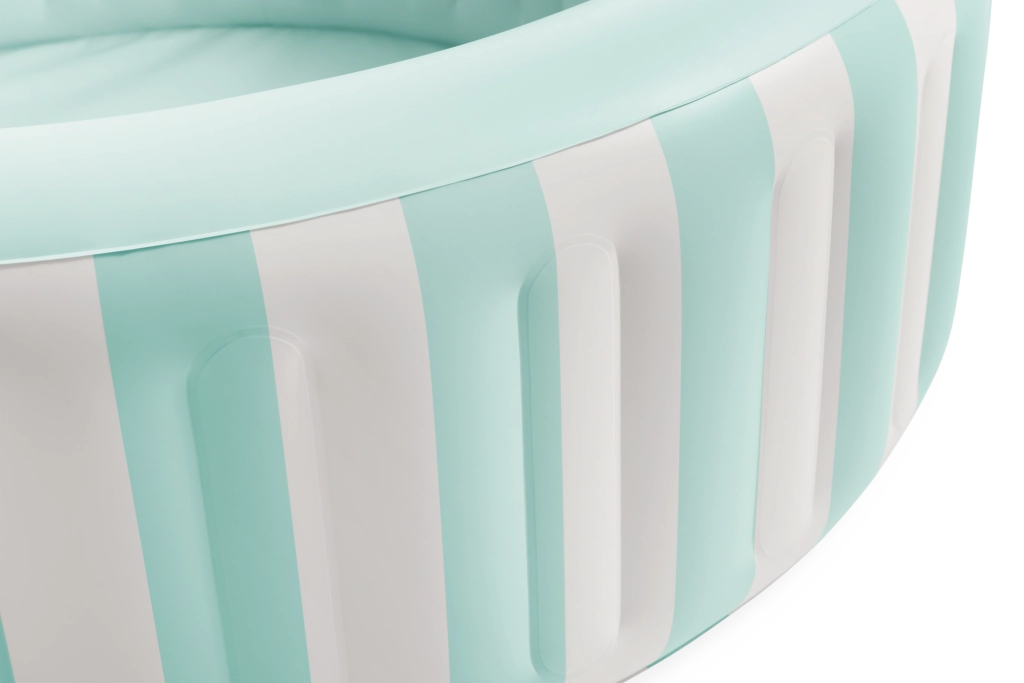 Nadmuchiwany basen Coastal Luxe w nowoczesnym, nadmorskim stylu jest idealny do letnich zabaw wodnych młodszych dzieci. Pionowe paski w jasnym turkusie i bieli działają odświeżająco, a gładka wewnętrzna powierzchnia w delikatnym turkusie buduje wrażenie czystości i spokoju. Wytrzymałe PVC i wielokomorowe ścianki zapewniają stabilność oraz wygodę podczas siedzenia i zabawy.