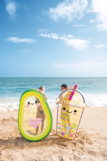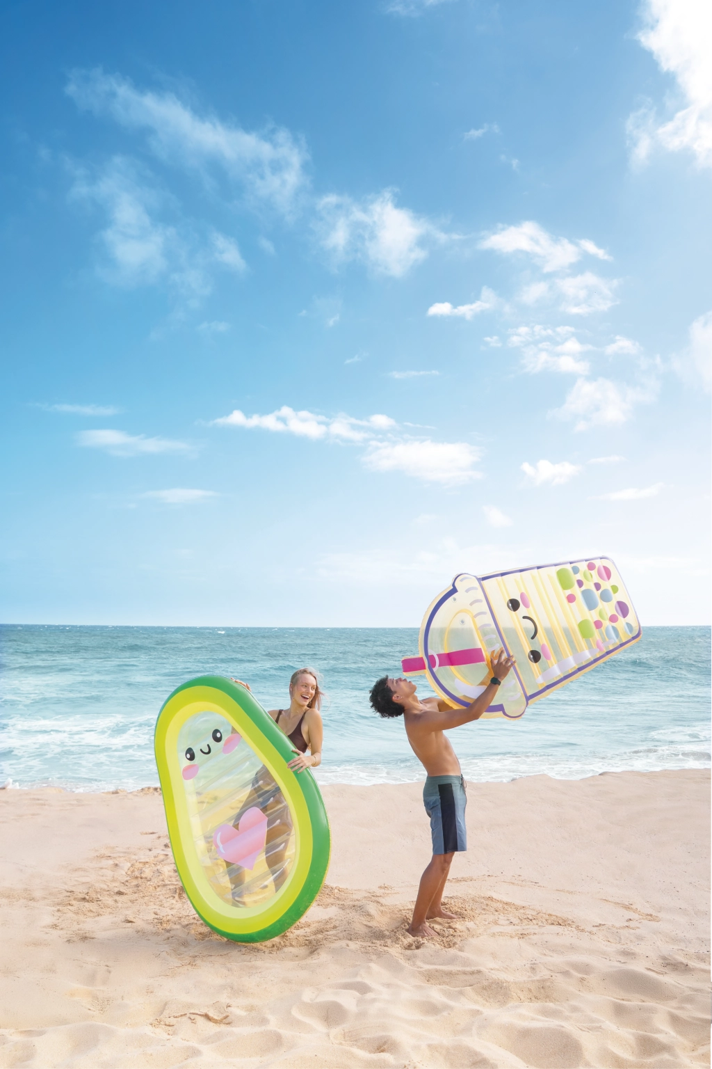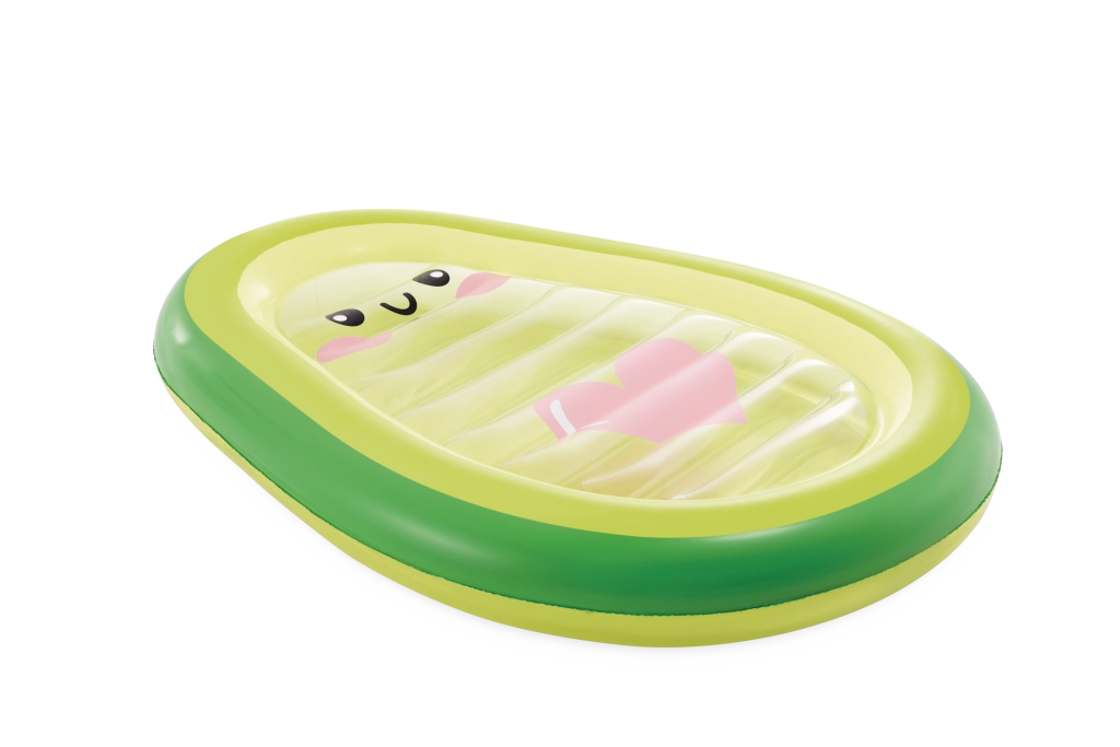 Nadmuchiwany leżak Avocado Buddy wnosi do letniego relaksu świeży design inspirowany awokado. Zewnętrzna krawędź w odcieniach zieleni płynnie przechodzi w jaśniejsze tony i żółć, a przezroczysty środek z uroczą rysunkową buźką i różowym sercem nadaje leżakowi oryginalny wygląd. Wytrzymałe przezroczyste PVC idealnie sprawdza się do wodnych zabaw i pozwala obserwować to, co dzieje się pod powierzchnią wody.