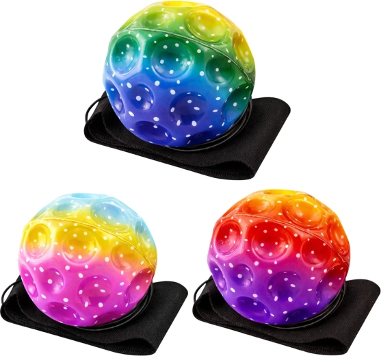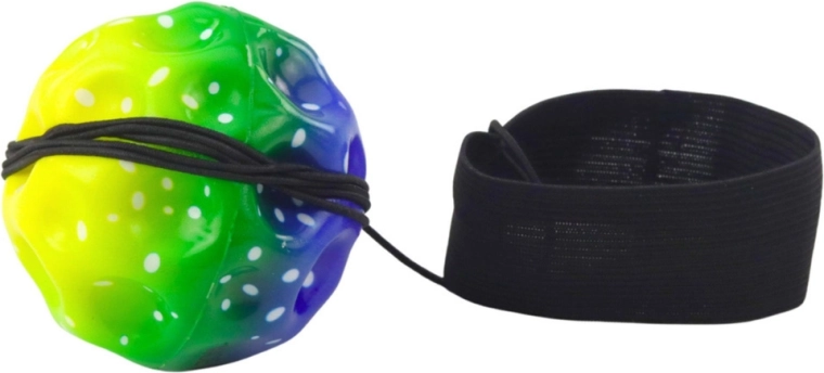 Kolorowa sensoryczna piłeczka na elastycznej gumce z regulowaną bransoletką na nadgarstek do bezpiecznej zabawy w domu i na zewnątrz. Jest miękka, leciutka i sprężysta, z dołkowaną powierzchnią stymulującą dotyk. Świetnie pomaga trenować koordynację, refleks i łagodzi stres bez obaw o zgubienie piłeczki.