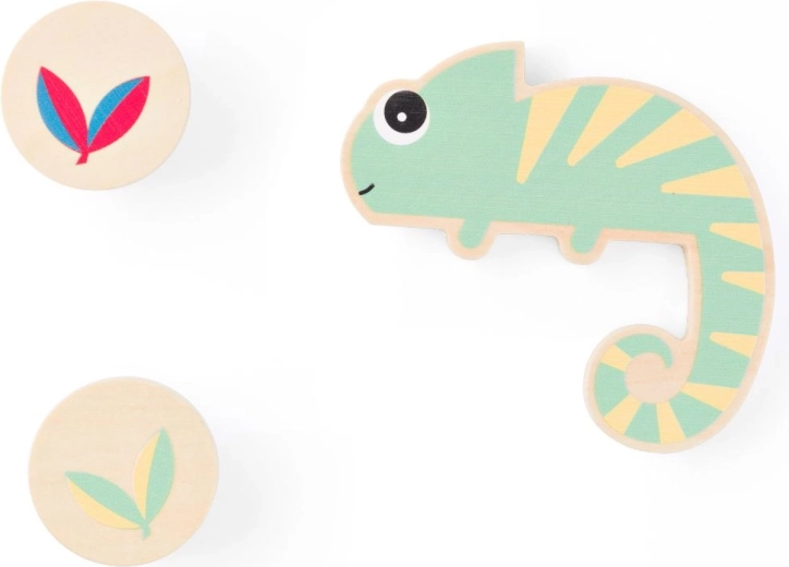 Drewniane okrągłe żetony z liśćmi zachęcają dzieci do porównywania i logicznego myślenia: szukaj liścia z dwoma kolorami, których kameleon nie ma.