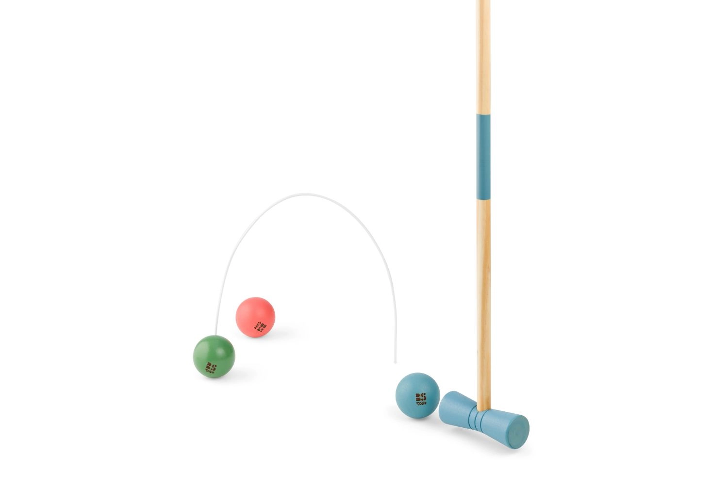 - 4 młotki (ok. 57 × 10 × 3,5 cm), 2 paliki końcowe (ok. 27,5 × 1,5 × 1,5 cm), 10 bramek (długość ok. 52 cm), drewniane kule (średnica 5 cm)
