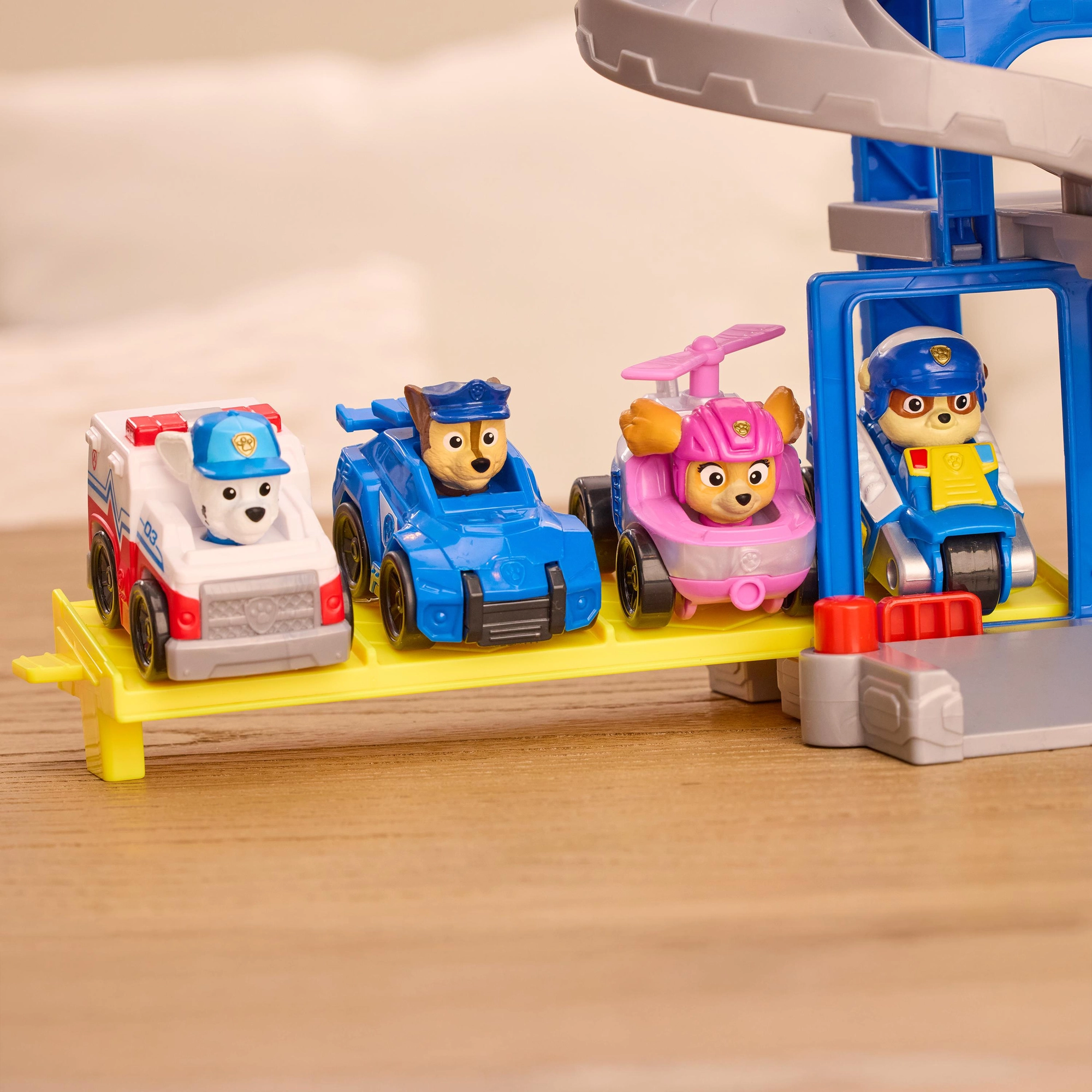 Centrala Pup Squad HQ to serce każdej misji ratunkowej. Dzieci wwożą Chase’a dzięki obrotowej windzie na szczyt wieży, aktywują zjeżdżalnię i za pomocą wyrzutni wysyłają go do akcji, by uratować Kitty i powstrzymać psotnego burmistrza Humdingera. Solidna, kolorowa konstrukcja wspiera wyobraźnię i rozwój małej motoryki.