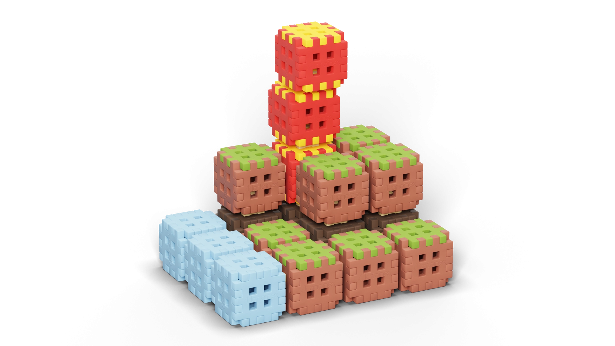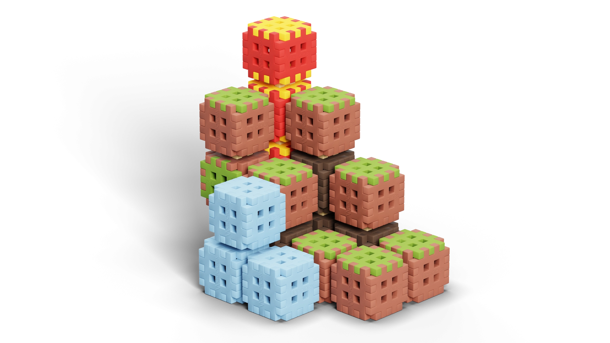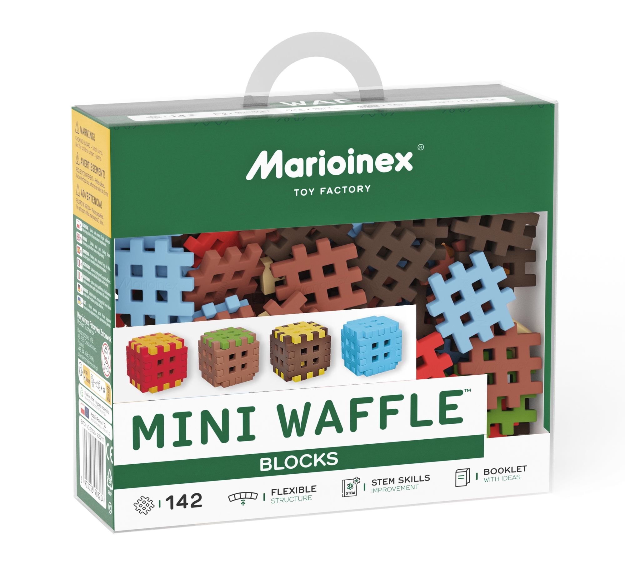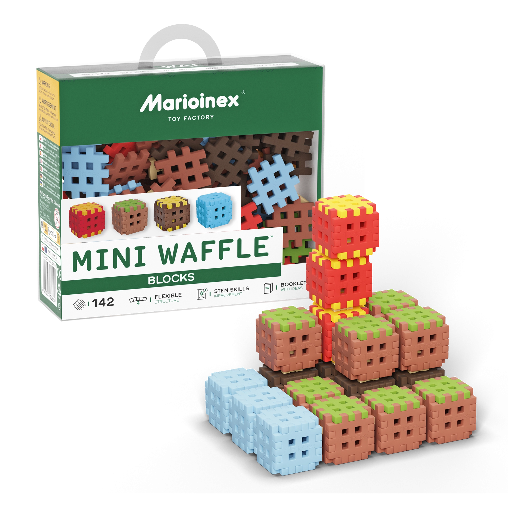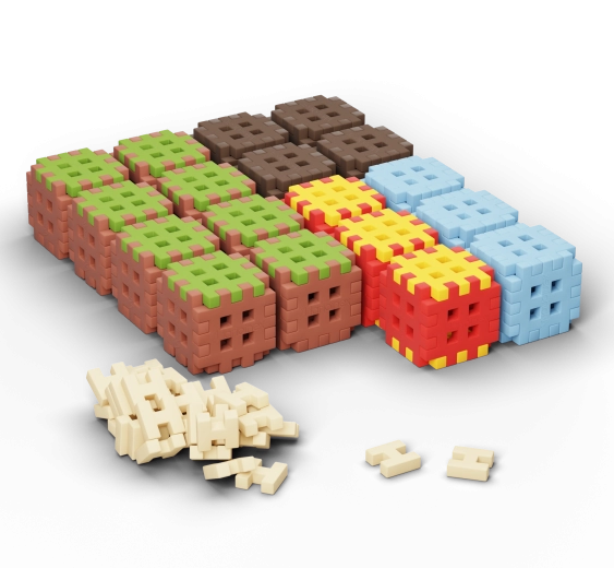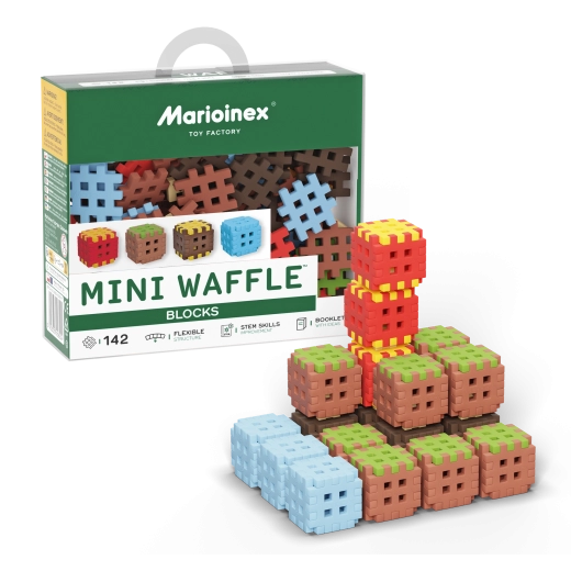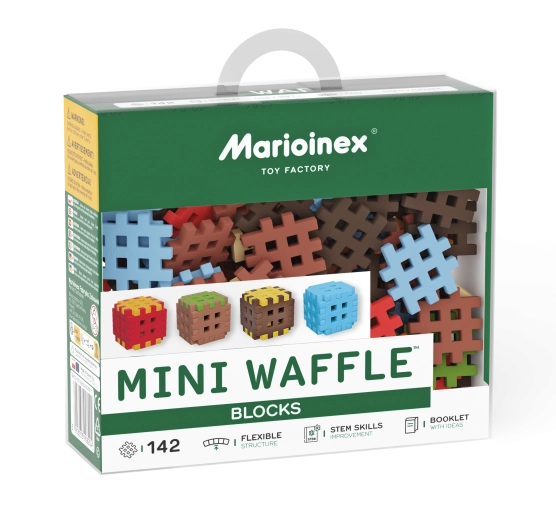 Zestaw Mini Waffle Blocks zawiera 142 kolorowe elementy inspirowane naturą – brązową „ziemią”, zieloną „trawą”, lodowoniebieskimi częściami oraz energetycznymi czerwono‑żółtymi akcentami. Dzięki miękkiemu i elastycznemu materiałowi klocki są przyjemne w dotyku i łatwo łączą się nawet w małych dłoniach.