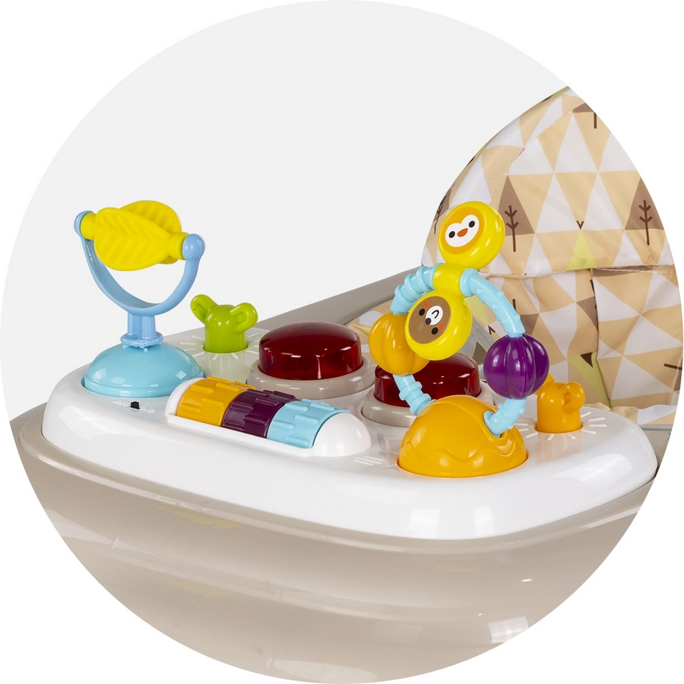 Interaktywny panel z kolorowymi zabawkami, przyciskami, efektami świetlnymi i 12 melodiami wspiera rozwój małej motoryki, percepcji sensorycznej oraz koordynacji. Panel jest odpinany, więc dziecko może bawić się także poza chodzikiem. Konstrukcja łatwo się składa, co oszczędza miejsce i ułatwia przenoszenie.