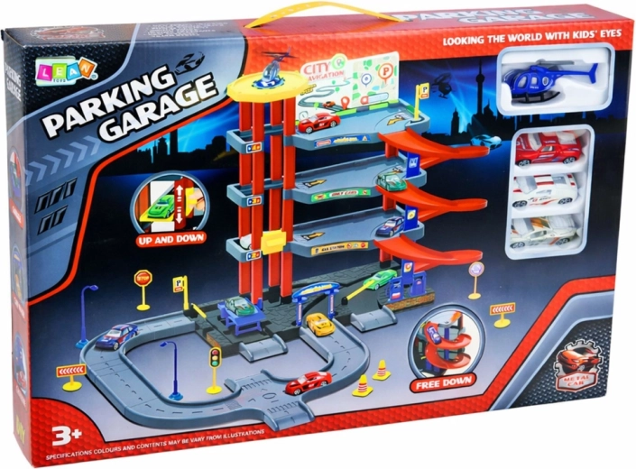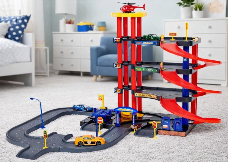 Zbuduj własne tętniące życiem miasto! Solidne, czteropoziomowe garaże wiernie odwzorowują prawdziwe miejskie parkowanie. Dzieci mogą wwozić autka systemem windy między piętrami, pędzić po długich rampach i lądować na lądowisku dla helikopterów. W zestawie jest także stacja paliw, stacja kontroli pojazdów oraz wiele miejsc parkingowych.