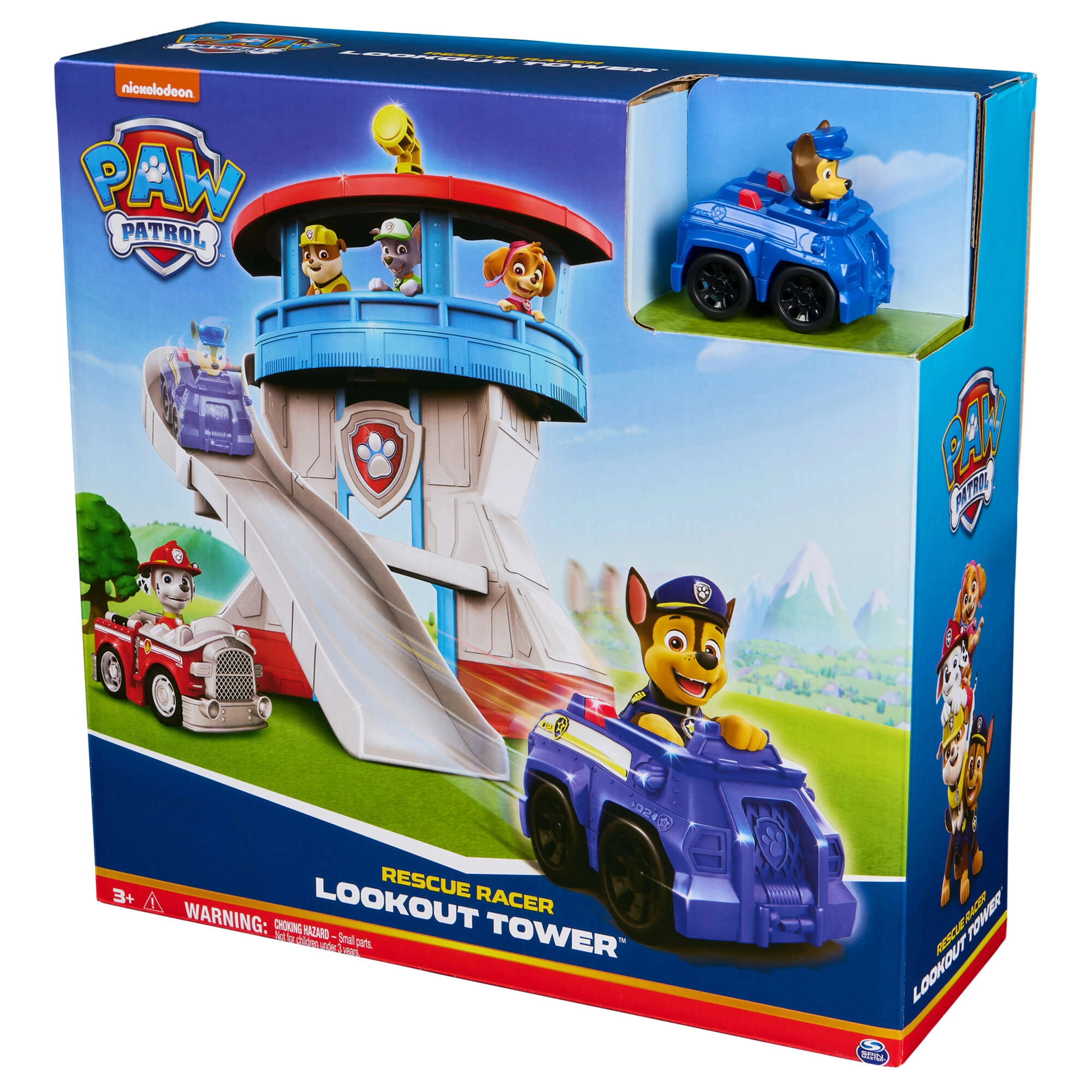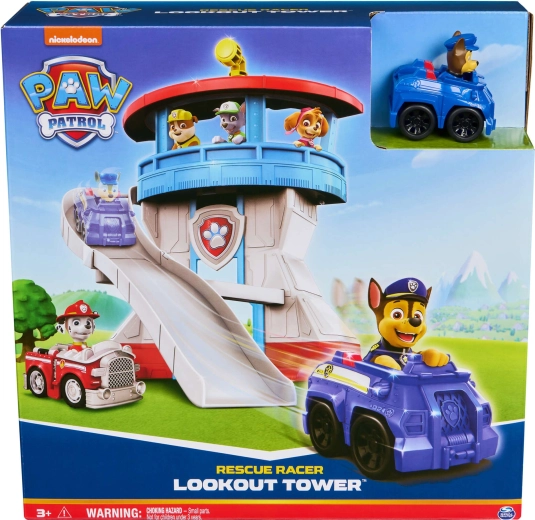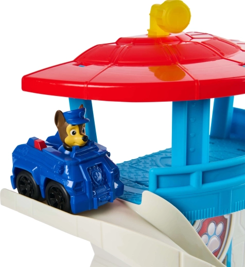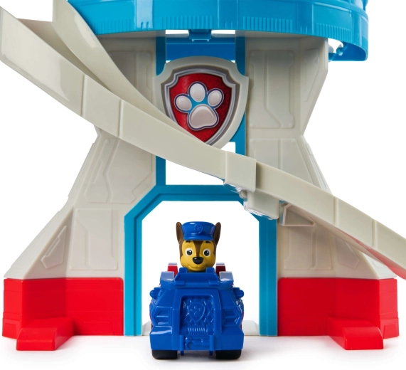 Ten kolorowy zestaw zabaw inspirowany serialem Paw Patrol oferuje dzieciom realistyczną bazę do ich misji ratunkowych. Wieżę zdobi ikoniczna psia odznaka, a na górze znajduje się obrotowy żółty peryskop, dzięki któremu Chase może kontrolować okolicę. W zestawie jest także kompaktowe niebieskie autko z figurką Chase’a – gotowe do szybkiego zjazdu po zakrzywionej zjeżdżalni.