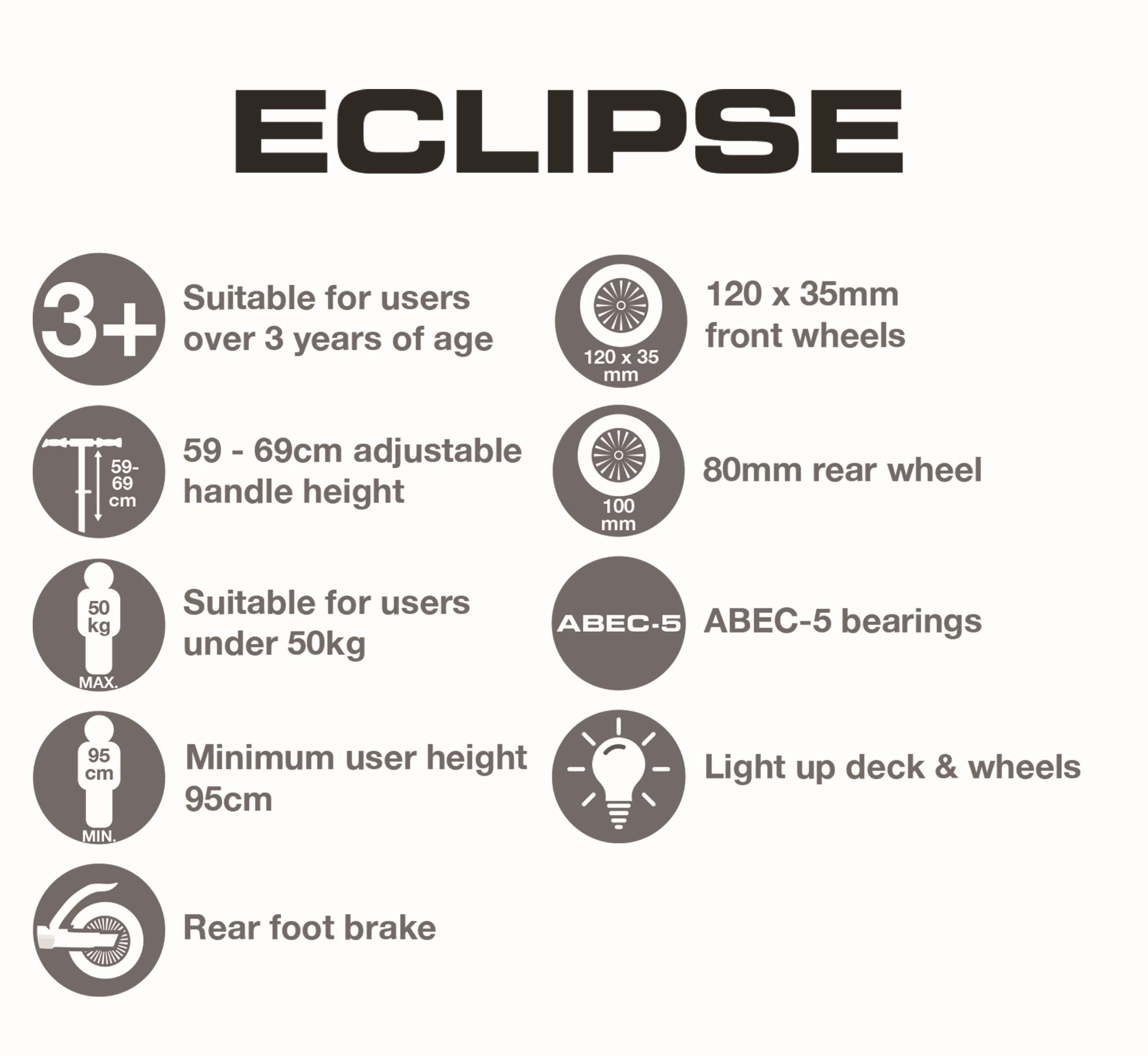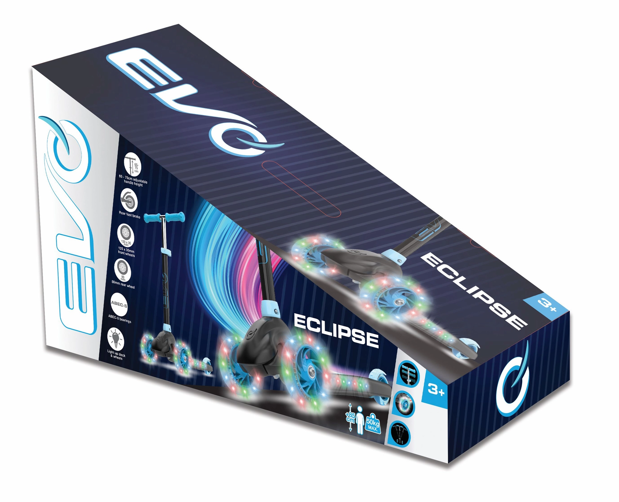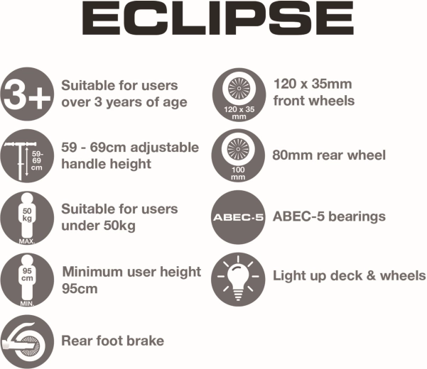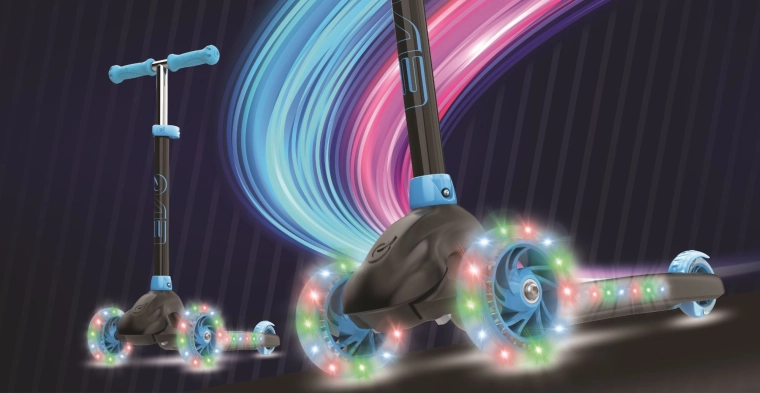 Hulajnoga EVO Eclipse została zaprojektowana jako pierwszy krok w świat jazdy – trzy koła gwarantują wysoką stabilność, a lekka konstrukcja i hamulec nożny nad tylnym kołem dają pewność przy zatrzymywaniu. Podświetlenie LED kół i podestu zamienia każdą trasę w zabawną świetlną atrakcję i poprawia widoczność o zmierzchu.