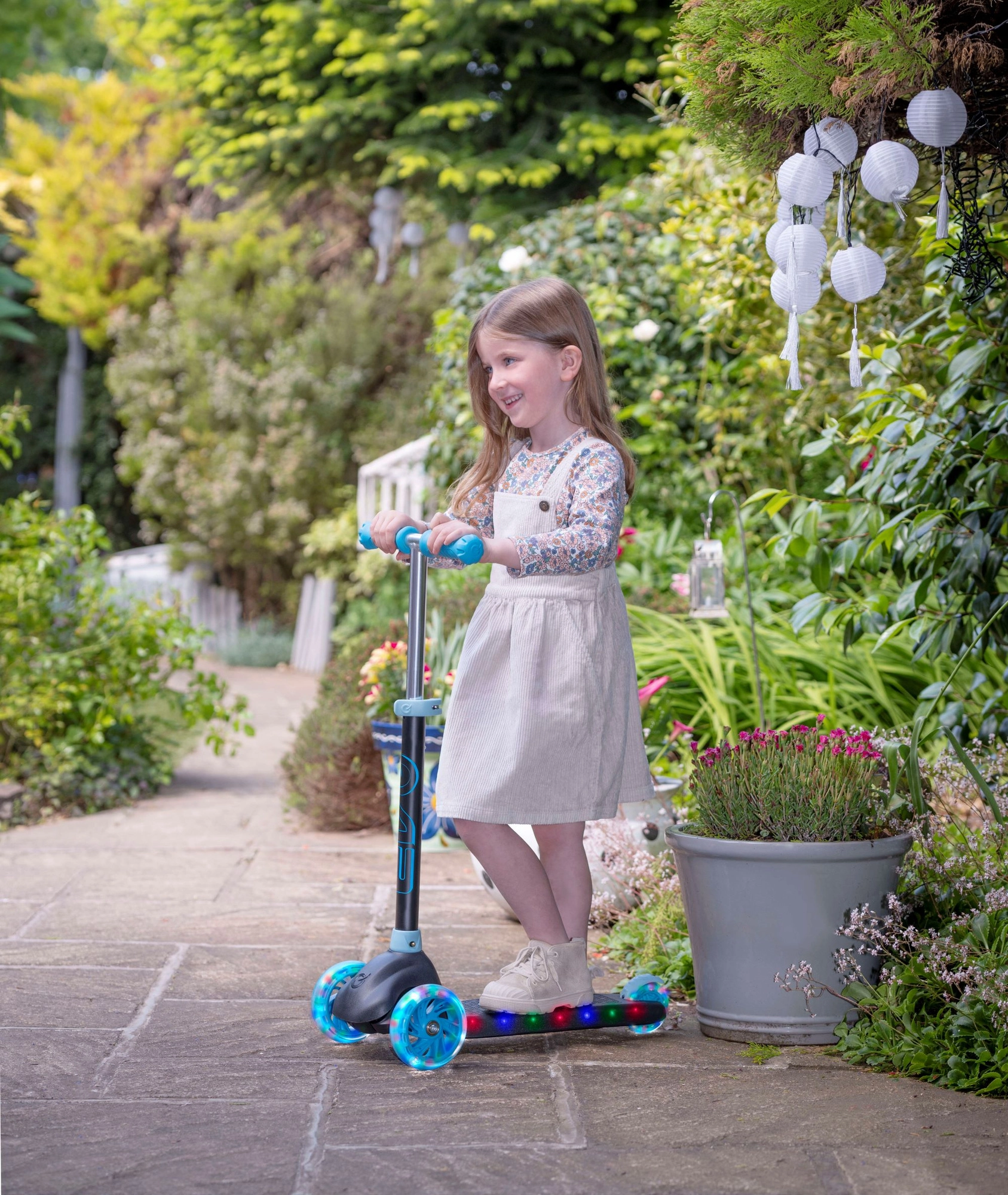 Świecące koła oraz krawędź podestu dodają efektu i poprawiają widoczność o zmierzchu. Wystarczy włożyć 3× AAA (baterie nie są dołączone).