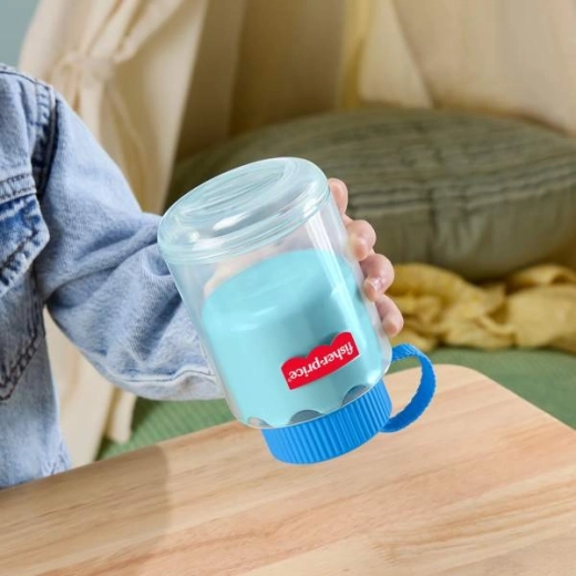 Elementy zaprojektowane są dla małych rączek: duży guzik przy kieszeni, łatwy do naciśnięcia klips, wyginana „chrupiąca” przekąska oraz „butelka”, która zachęca do naśladowania nalewania. Wszystkie części mieszczą się w plecaczku, więc to idealne do domu i w podróż.