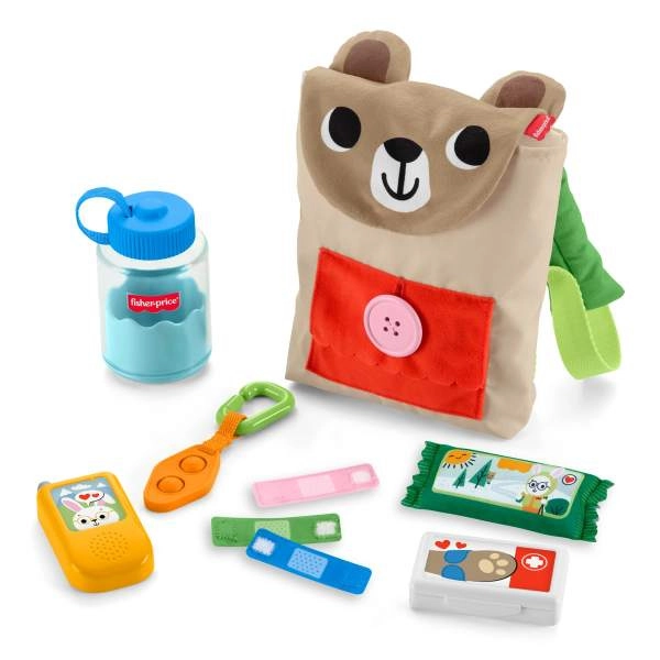Ten wesoły zestaw od Fisher‑Price zamieni każdą wyprawę w przygodę. Miękki plecaczek‑miś z kieszonką na guzik, klipsem i pętelkami skrywa sprytne akcesoria: „butelkę na wodę”, dziecięcą „krótkofalówkę/telefon”, materiałowe plastry na rzep, przekąskę i inne elementy zachęcające do naciskania, otwierania i zapinania. Dzieci ćwiczą koordynację ręka‑oko, trenują chwyt i zręczność, bawiąc się w biwakowanie i opiekę.