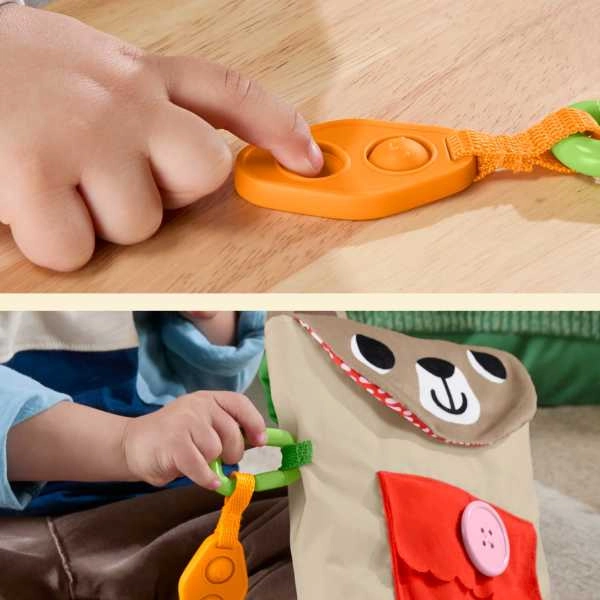 Naciśnij klips, zapnij kieszonkę, zegnij „chrupiącą” przekąskę i przyklej materiałowe plastry na rzep – każda aktywność wzmacnia koordynację i zręczność.