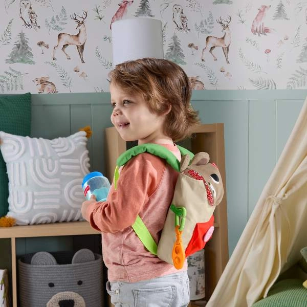 Lekki tekstylny plecaczek z dużym guzikiem i kieszonką pomieści wszystkie akcesoria. Wygodne szelki i trwałe wykonanie są idealne do zabawy w domu i w podróży.
