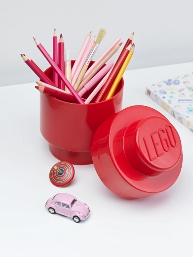 Wprowadź do wnętrza porządek i zabawny design dzięki okrągłemu pudełku inspirowanemu kultowym klockiem LEGO. Dzięki kompaktowym wymiarom świetnie sprawdzi się na biurku, półce i w dziecięcym kąciku, a niezawodnie pomieści przybory do pisania, drobne zabawki lub elementy zestawów konstrukcyjnych.