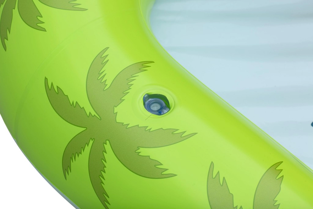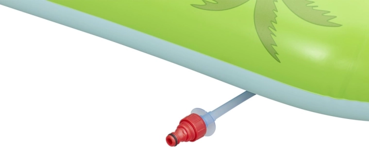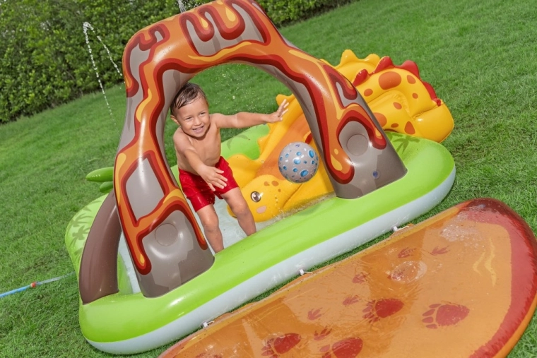 Nadmuchiwane centrum zabaw z dinozaurami to idealny wybór dla aktywnej letniej zabawy dzieci od 2 lat. Zielony basenik z nadrukiem palm i niebieskim dnem mieści ok. 150 l wody, a osobny wodny dywan z motywem lawy dodaje kolejne 80 l dla miękkiego lądowania i radosnego dreptania. Zintegrowany zraszacz na wulkanicznym łuku łatwo podłączysz do węża ogrodowego i w kilka chwil stworzysz orzeźwiającą mgiełkę.