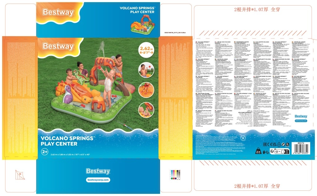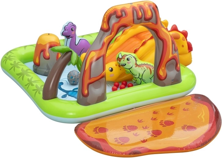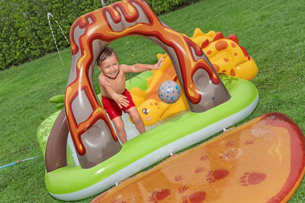 - zjeżdżalnia z poduszką do lądowania, wodny dywan, figurki dinozaurów, wulkaniczny łuk z otworem na piłeczki