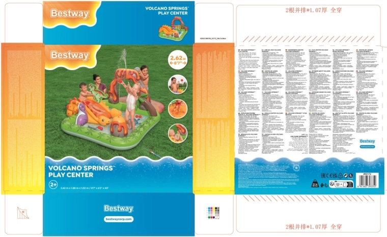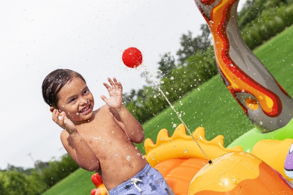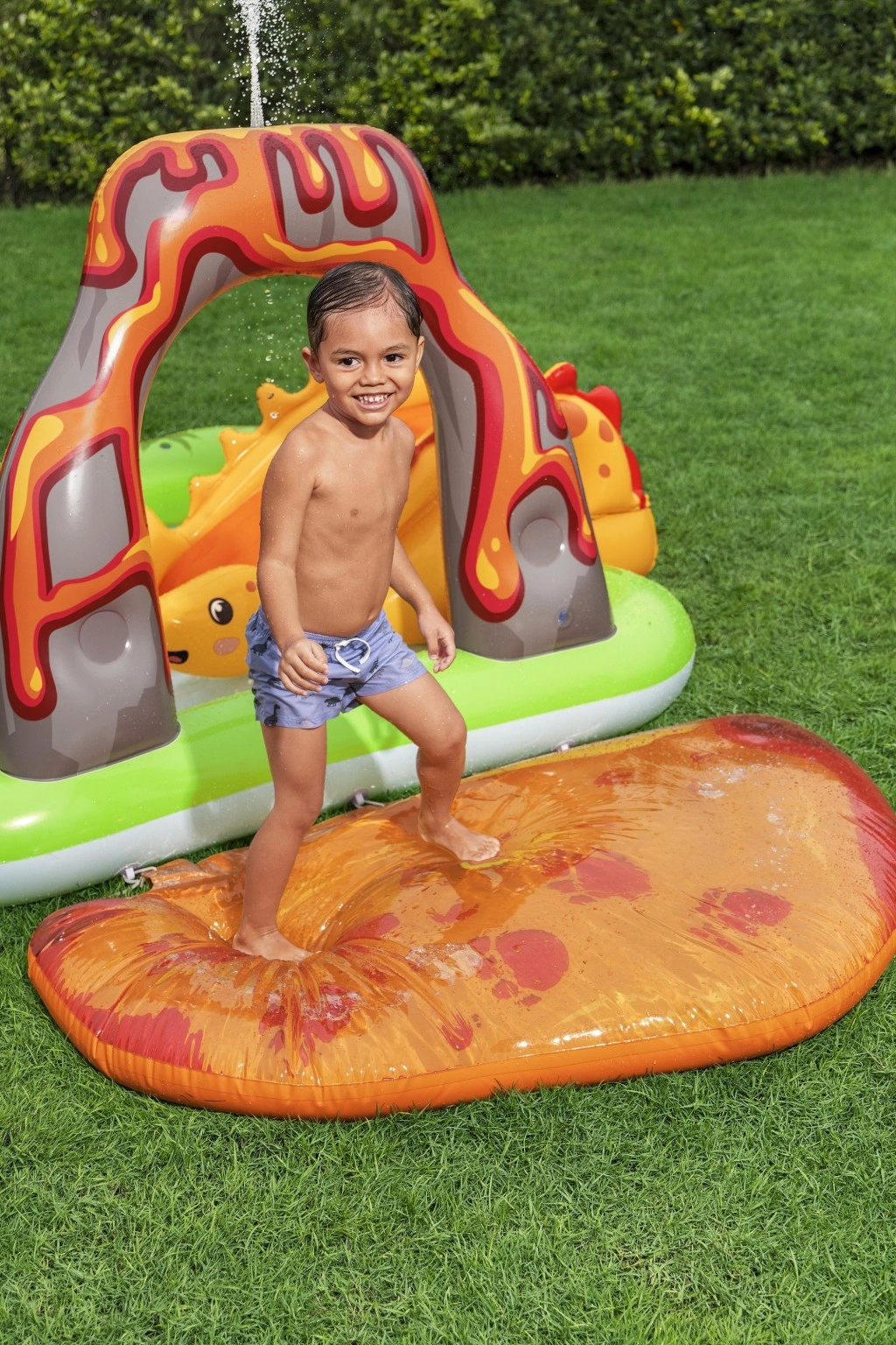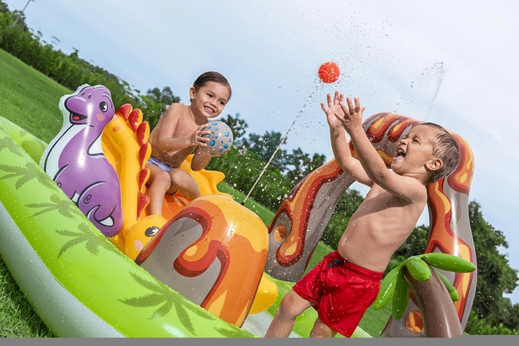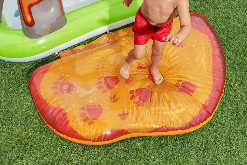 Rozkręć lato z tym kolorowym dmuchanym centrum zabaw w motywie dinozaurów, które zamieni każdy ogród w mały park wodny. Oferuje przestronny brodzik 262 × 188 × 102 cm, miękką zjeżdżalnię z poduszką do lądowania oraz zraszacz wodny podłączany do węża ogrodowego. Dzieci ucieszą figurka dinozaura, wulkaniczny łuk z otworem do rzucania piłeczkami oraz wodny dywan dla jeszcze większej pluskającej zabawy. Wytrzymały winyl zapewni bezpieczną i długą zabawę nawet przy częstym użytkowaniu.