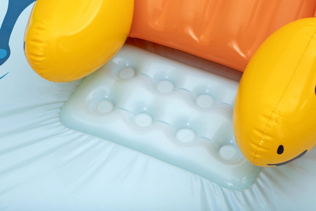 Żółty dinozaur ze zjeżdżalnią i dmuchaną poduszką zapewnia gładki ślizg i bezpieczne lądowanie także dla młodszych dzieci.