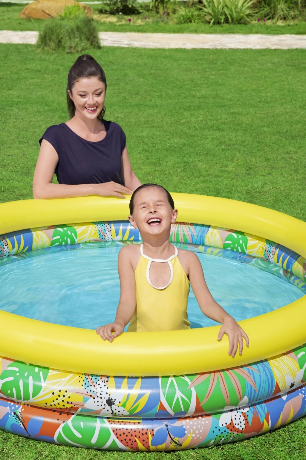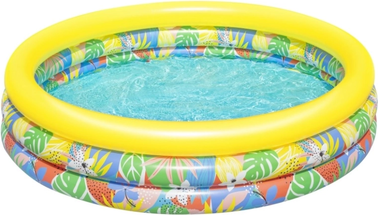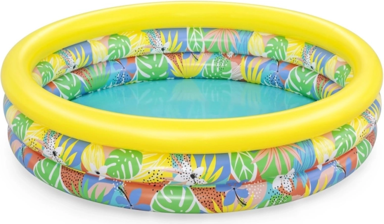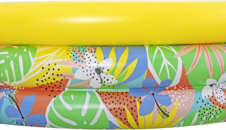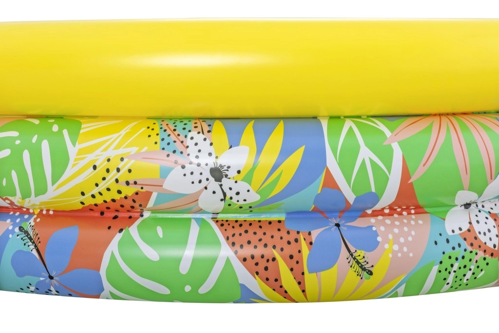 Nadmuchiwany dziecięcy basen Floral Paradise zapewnia dzieciom zabawę i orzeźwienie w upalne dni. Trzy niezależne komory powietrzne z zaworami bezpieczeństwa zwiększają stabilność i komfort, a mocne PVC wytrzymuje codzienne użytkowanie. Tropiczny nadruk liści i kwiatów z wyrazistym żółtym górnym pierścieniem wprowadzi do Twojego ogrodu wakacyjny klimat.
