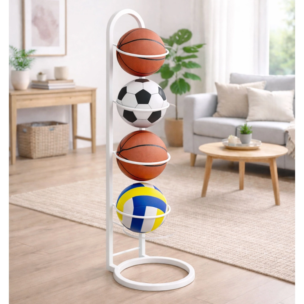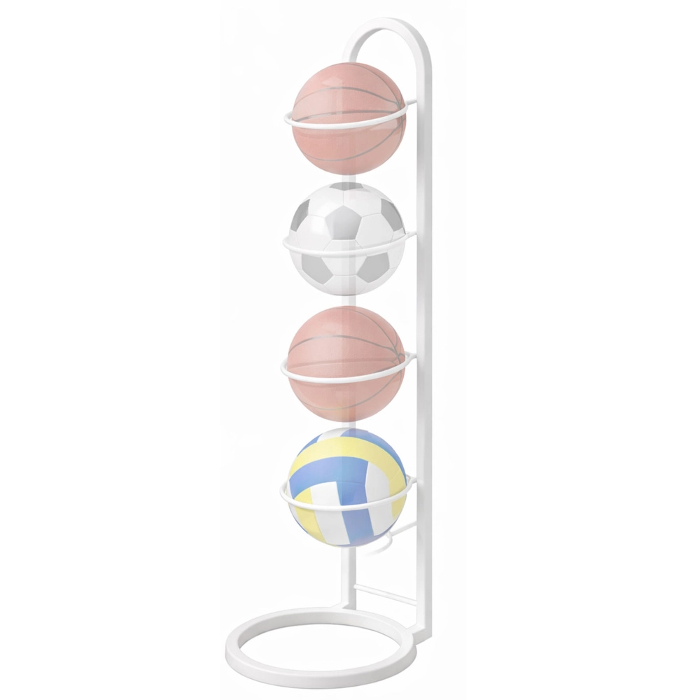 Praktyczny pionowy stojak na piłki z miejscem na 4 piłki utrzymuje sprzęt sportowy w porządku i pod ręką. Jego stabilna stalowa konstrukcja oraz oszczędne, pionowe wykonanie oszczędzają miejsce w domu, garażu i sali gimnastycznej. Każdy pierścień bezpiecznie utrzymuje piłkę i zapobiega jej stoczeniu się. Idealny do piłek do koszykówki, siatkówki i piłki nożnej.