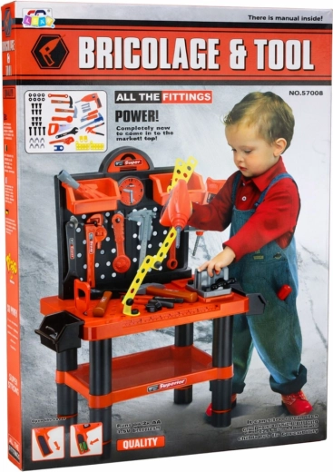 - Pełne wyposażenie: wiertarka, imadło, linijka, klucze, śrubokręty, piła, młotek i więcej.