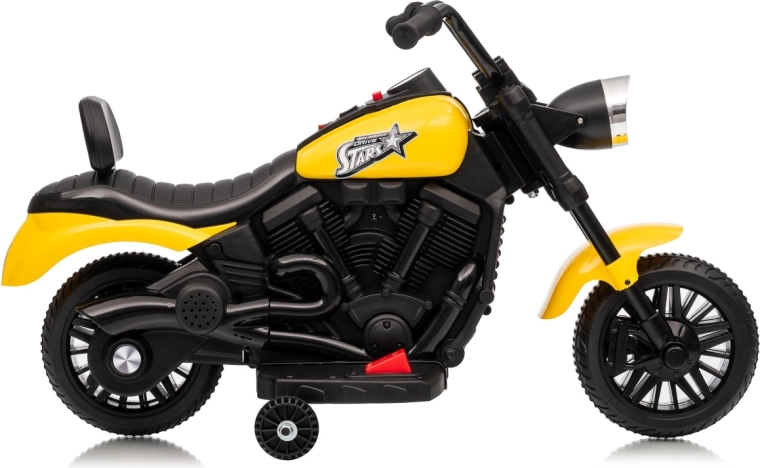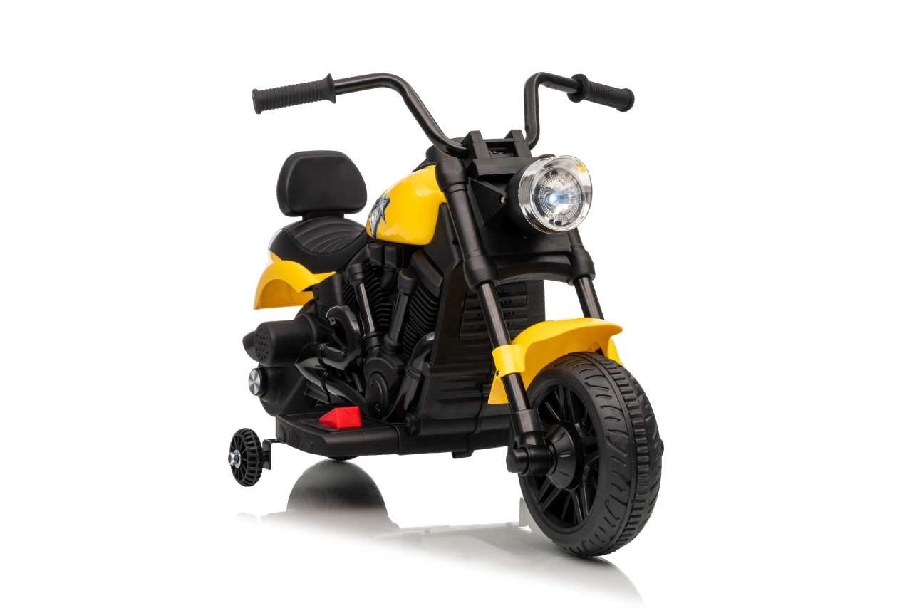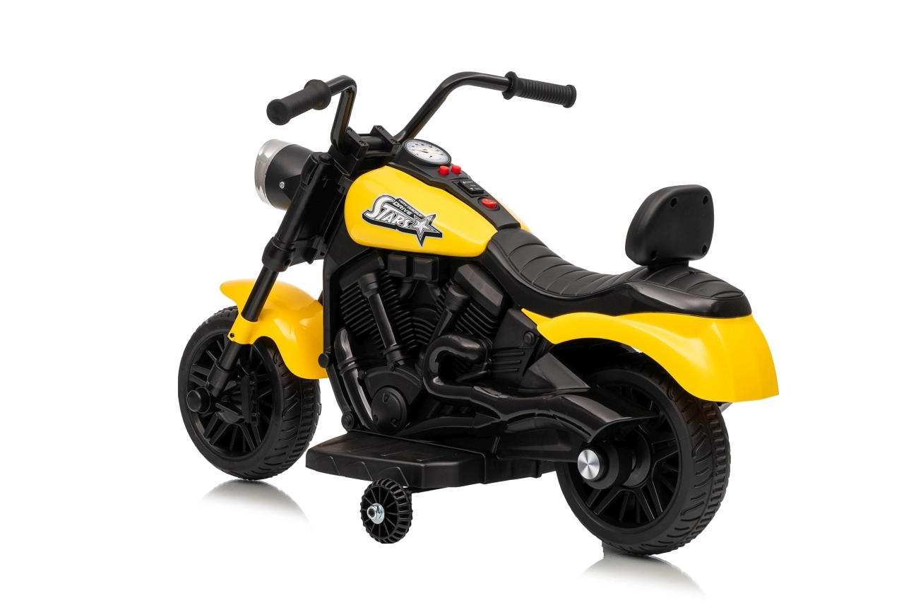 Stylowy dziecięcy motocykl elektryczny STAR w żółtym kolorze zapewnia bezpieczną zabawę dla małych kierowców. Dzięki łagodnemu startowi, stabilizującym bocznym kółkom i przedniemu światłu LED jazda jest wygodna i bezpieczna. Motocykl oferuje jazdę do przodu i do tyłu, łatwe uruchamianie przyciskiem oraz panel dźwiękowy z melodiami dla jeszcze większej radości z jazdy.