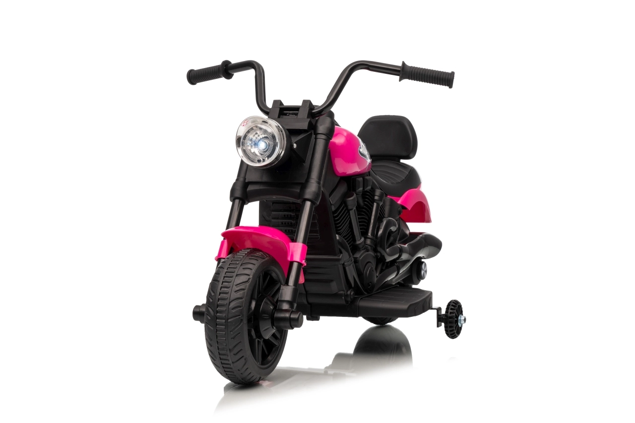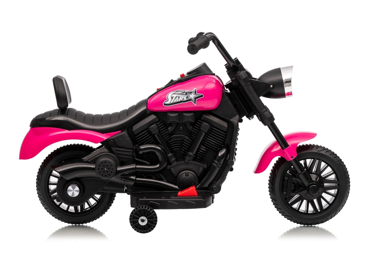 Różowy dziecięcy motocykl elektryczny STAR zapewnia bezpieczną jazdę dzięki kółkom bocznym, wygodnemu siedzisku oraz przedniemu światłu LED. Dzięki płynnemu startowi, jeździe do przodu i do tyłu oraz wbudowanym melodiom idealnie wspiera rozwój motoryki i pewności siebie małych kierowców.