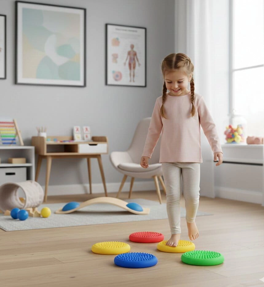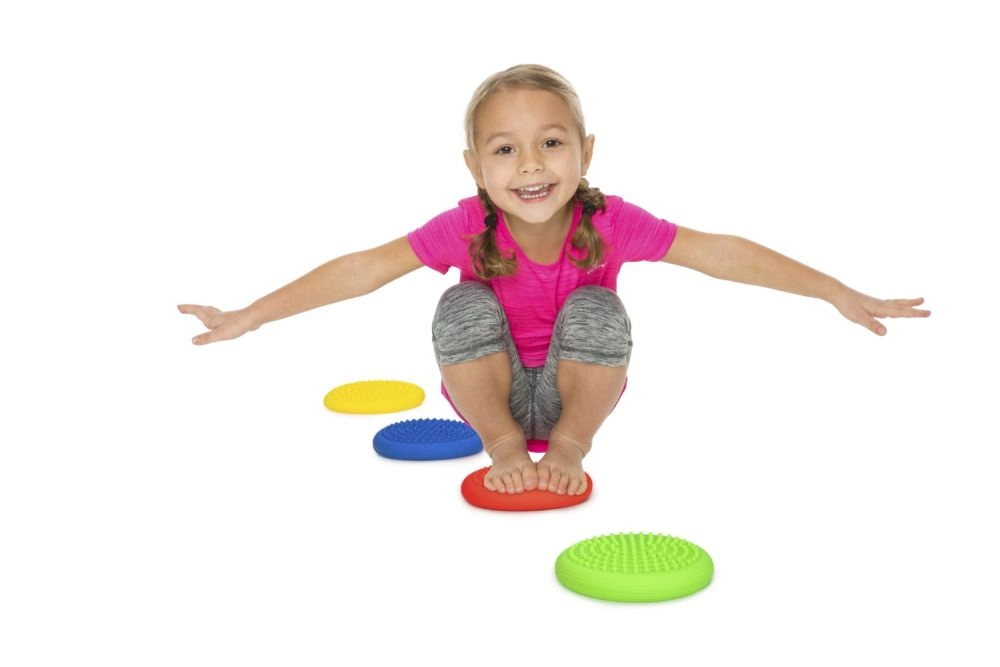 Kolorowe dyski motywują dzieci do ruchu, rozwijają koordynację, propriocepcję i wzmacniają głęboki system stabilizacji.
