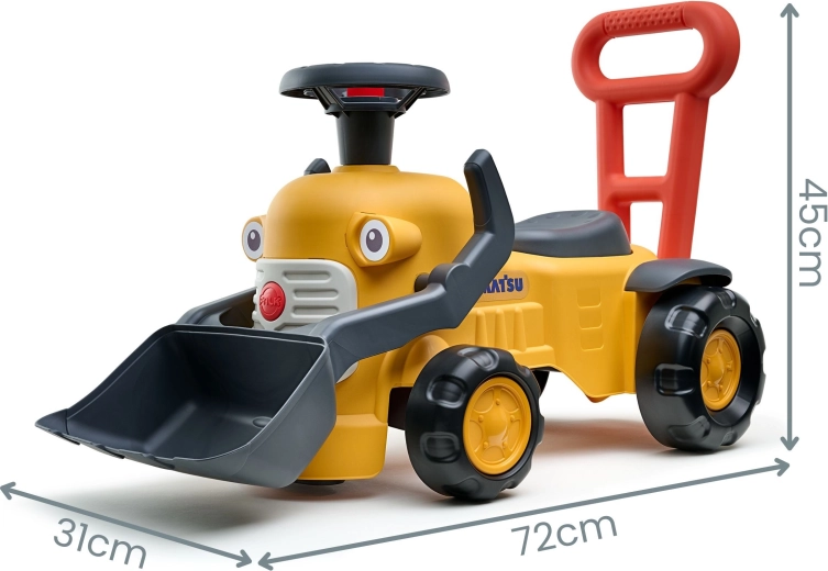 Ten dziecięcy jeździk w stylistyce maszyny budowlanej KOMATSU łączy zabawę z rozwojem umiejętności. Dzięki mechanicznie sterowanej przedniej łyżce mali budowniczowie mogą nabierać piasek lub klocki, a klakson na kierownicy dodaje zabawie realistycznych elementów. Wysokie ergonomiczne oparcie/uchwyt służy jako poręcz do pchania na pierwsze kroki i lepszą stabilność.