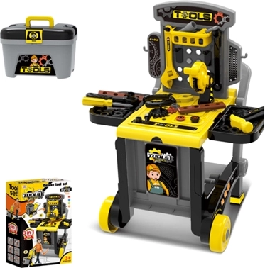 Ten dziecięcy warsztat zawiera wszystko, czego mały naprawiacz potrzebuje: blat roboczy, praktyczną szafkę oraz wózek ułatwiający przenoszenie narzędzi. Realistyczne wykonanie pobudza wyobraźnię i uczy dzieci podstaw porządku oraz organizacji.