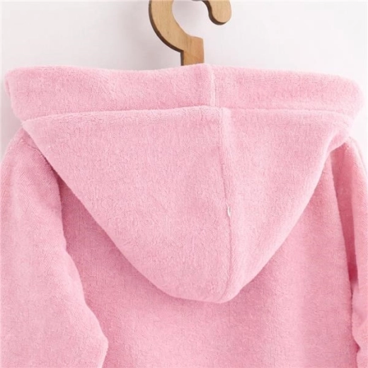 Różowy dziecięcy szlafrok New Baby wykonany jest z wysokiej jakości frotte (240 g/m²) ze 100% bawełny, które jest przyjemne w dotyku, świetnie chłonie wodę i szybko ogrzewa. Kaptur chroni mokrą główkę przed chłodem, a wygodny krój zapewnia swobodę ruchów.