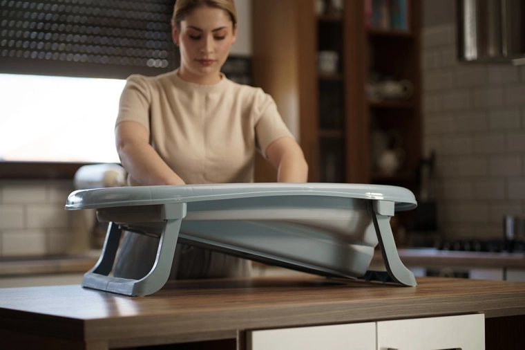 Wanienka składa się do wysokości około 10 cm. Składane nóżki i poręczna konstrukcja oszczędzają miejsce oraz ułatwiają przenoszenie i przechowywanie.