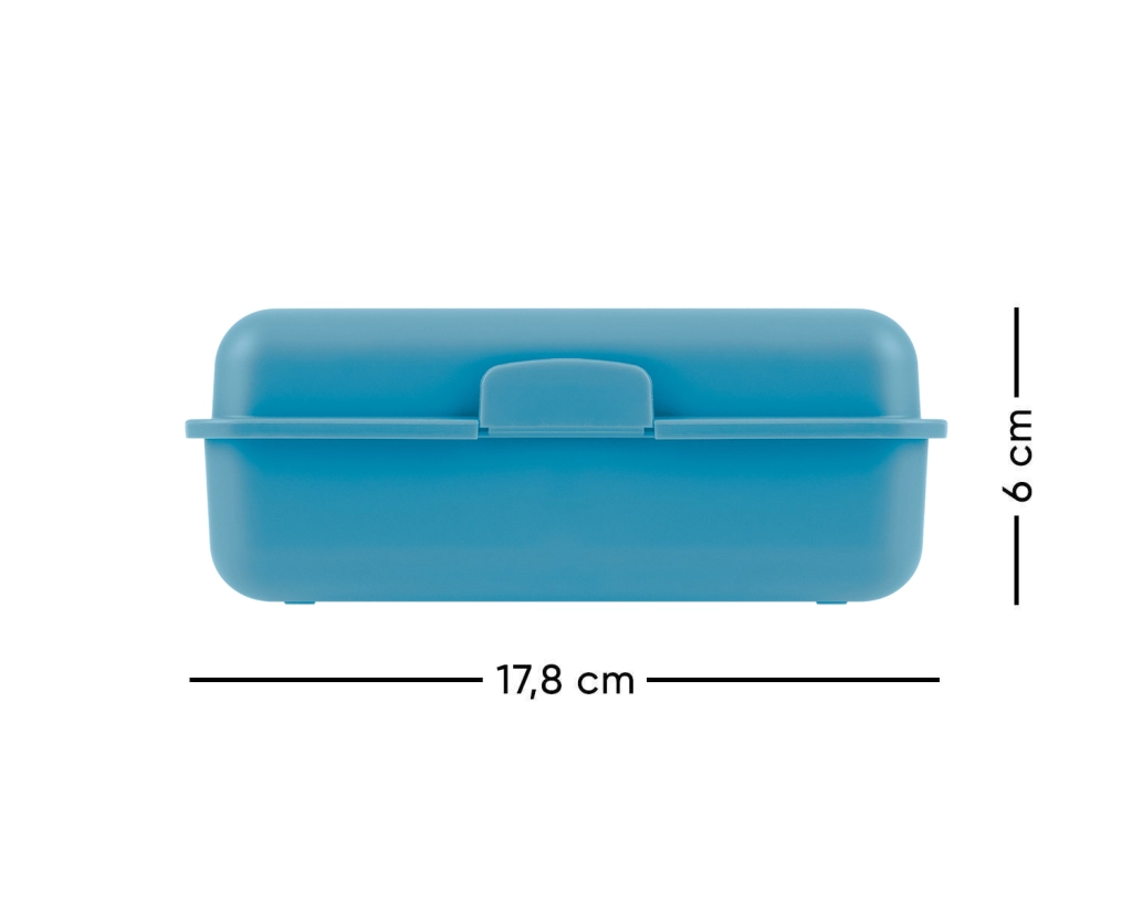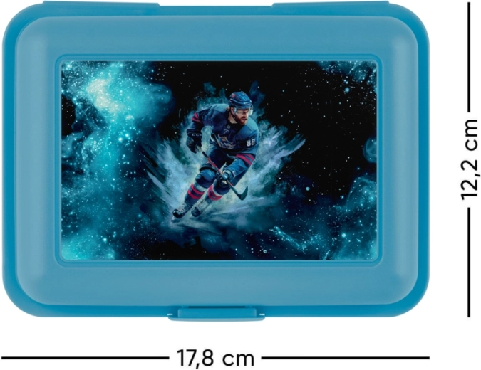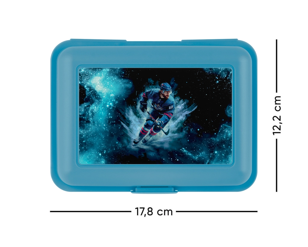 Praktyczne pudełko na śniadanie dla małych i dużych sportowców. W niebieskiej wersji z motywem Hokej oferuje bezpieczne zamknięcie na jeden zatrzask oraz przegrodę dzielącą dla przejrzystego ułożenia jedzenia. Wytrzymałe plastikowe wykonanie do codziennego użytku.