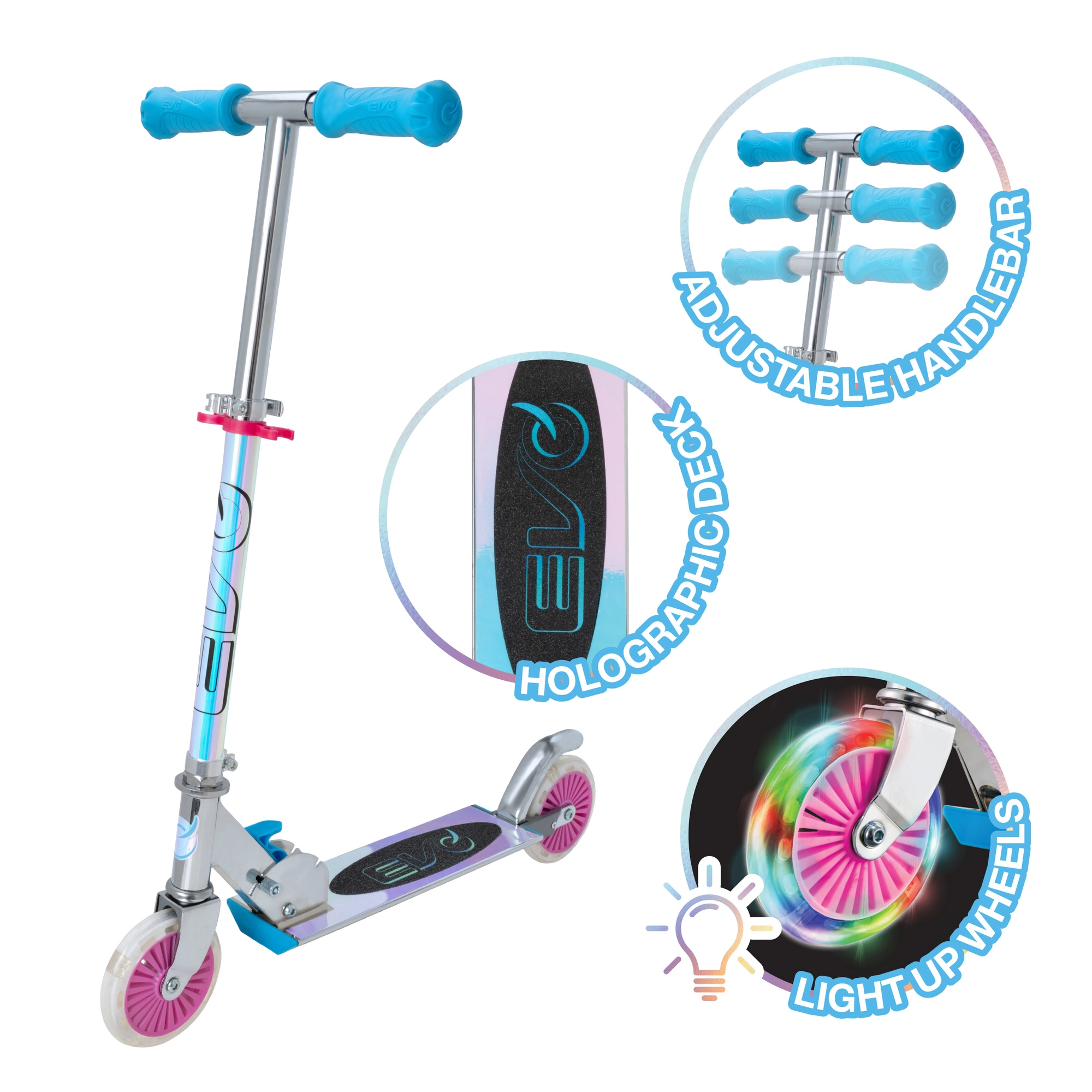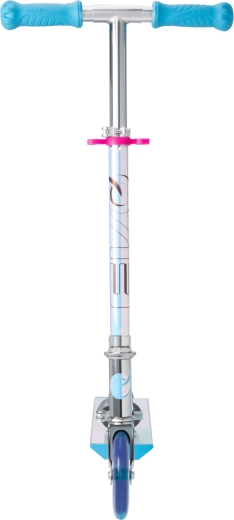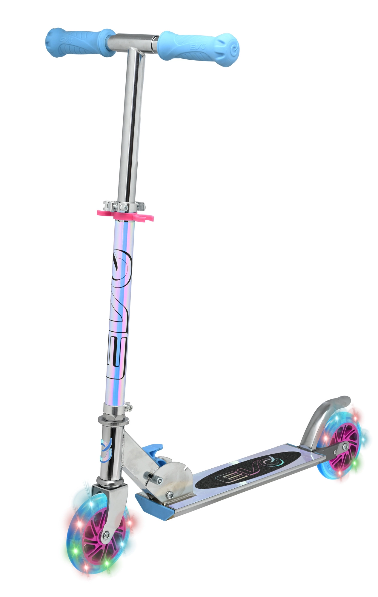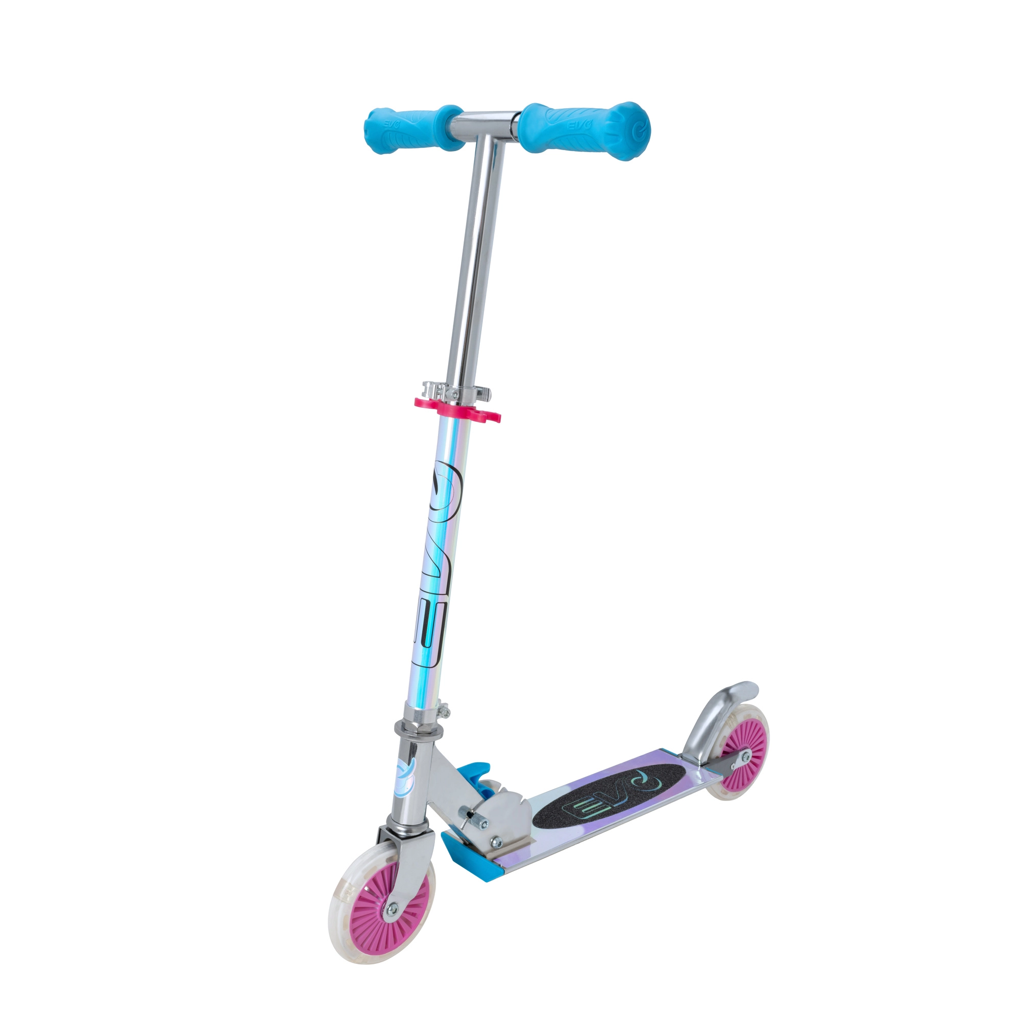 Lekka i wytrzymała dziecięca hulajnoga EVO z świecącymi kołami LED, składanym ramą i regulowaną kierownicą dla dzieci od 5 lat. Oferuje płynną jazdę dzięki łożyskom ABEC-5, tylny hamulec nożny dla bezpiecznego zatrzymywania oraz maksymalne obciążenie 50 kg. Świetny wybór do zabawy w parku i na chodniku.