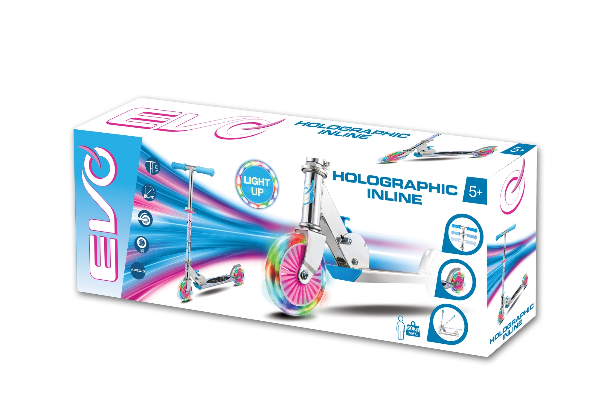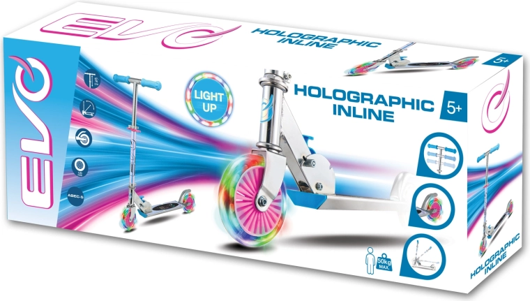 Hulajnoga EVO Holographic Inline łączy zabawę i bezpieczeństwo. Dzięki świecącym kołom LED każda jazda jest atrakcyjna, a regulowana wysokość kierownicy (ok. 67–77 cm) pozwala wygodnie dopasować ją do wzrostu dziecka. Składana konstrukcja ułatwia przenoszenie i przechowywanie w domu lub w bagażniku samochodu.