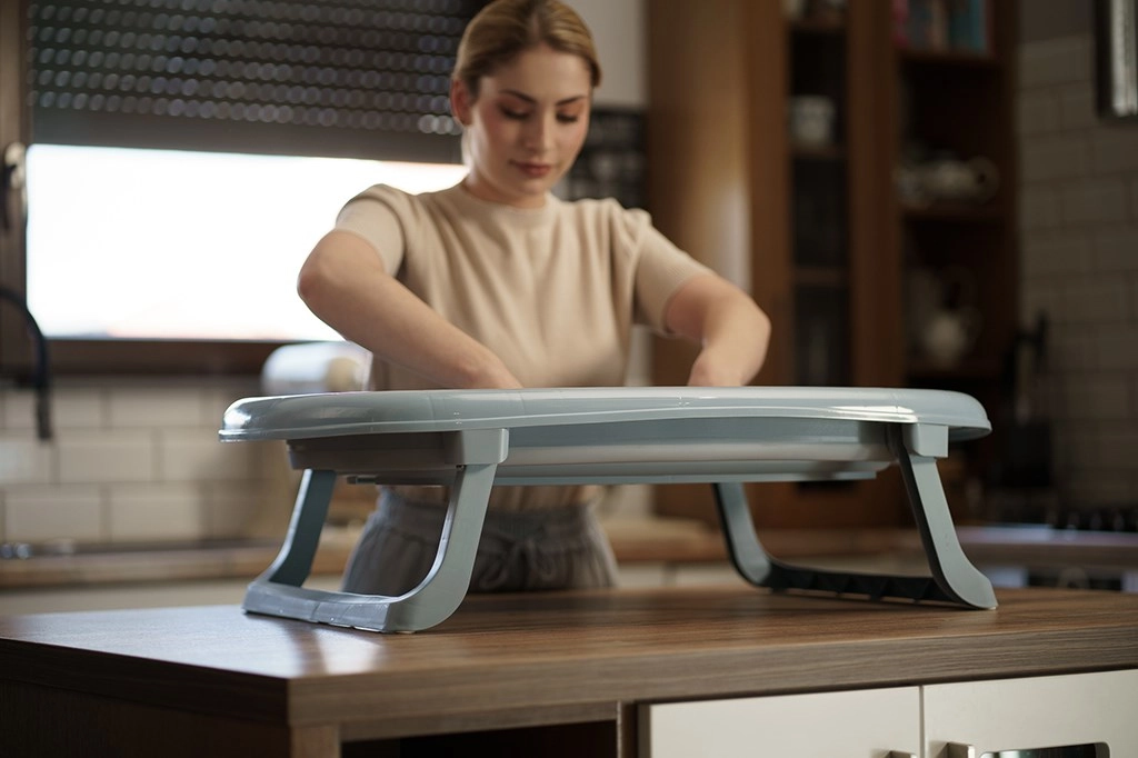 Solidna podstawa z polipropylenu, składane nóżki i podwyższone krawędzie zapewniają stabilność i bezpieczeństwo podczas codziennego użytkowania.