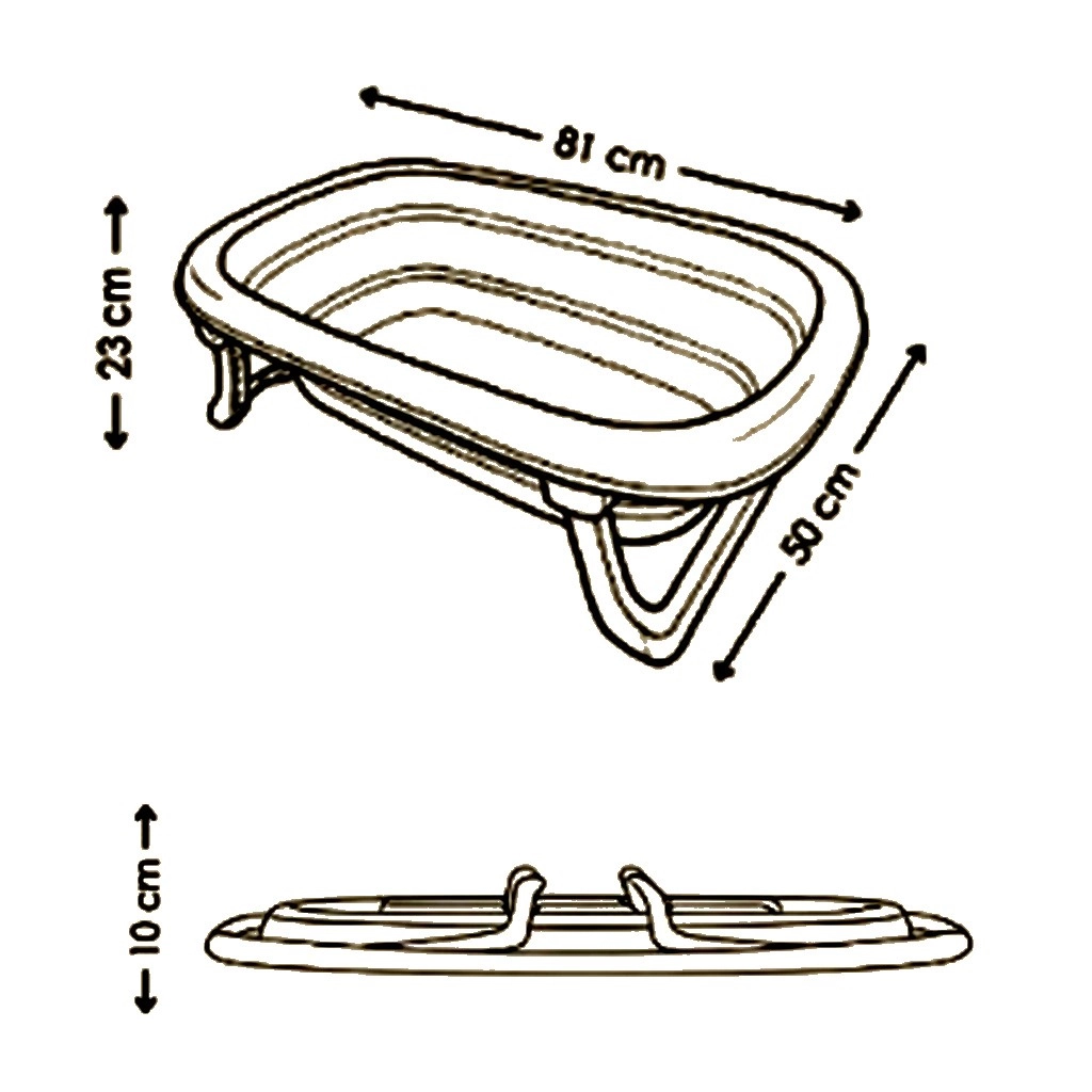 Dzięki solidnym plastikowym nóżkom, które składają się bezpośrednio pod wanienkę, produkt jest stabilny podczas użytkowania, a jednocześnie wyjątkowo kompaktowy w przechowywaniu – po złożeniu ma wysokość zaledwie 10 cm. Skład materiałowy łączy wytrzymały polipropylen w dolnej części oraz elastomer w części składanej, co zapewnia długą żywotność i wygodę.