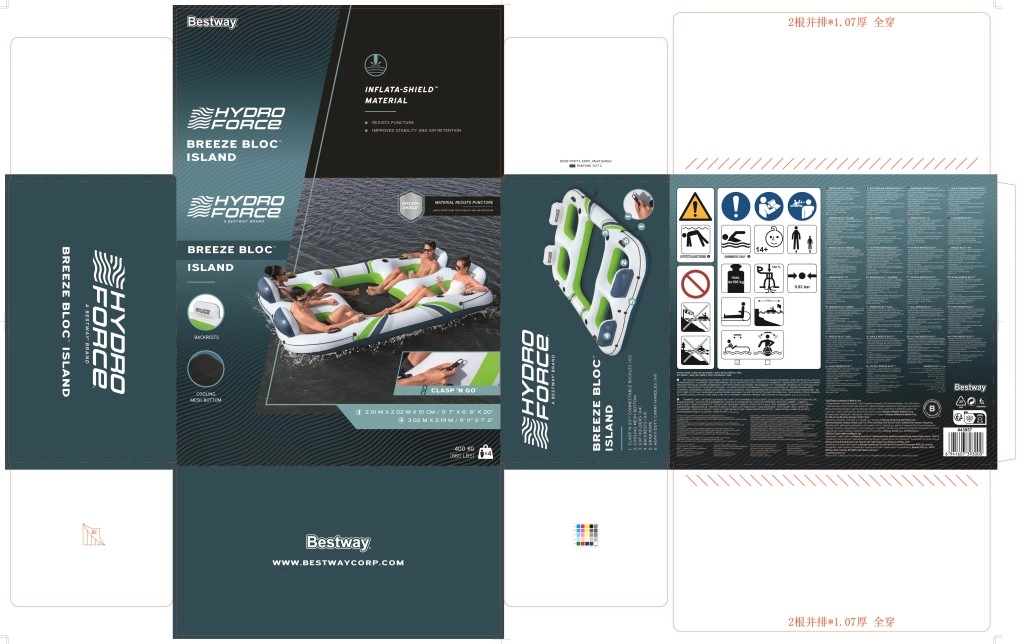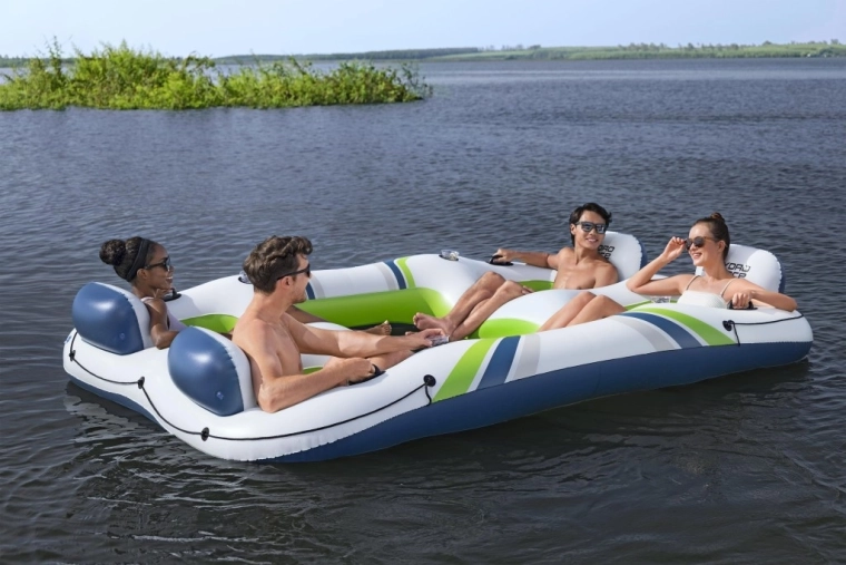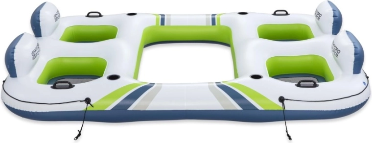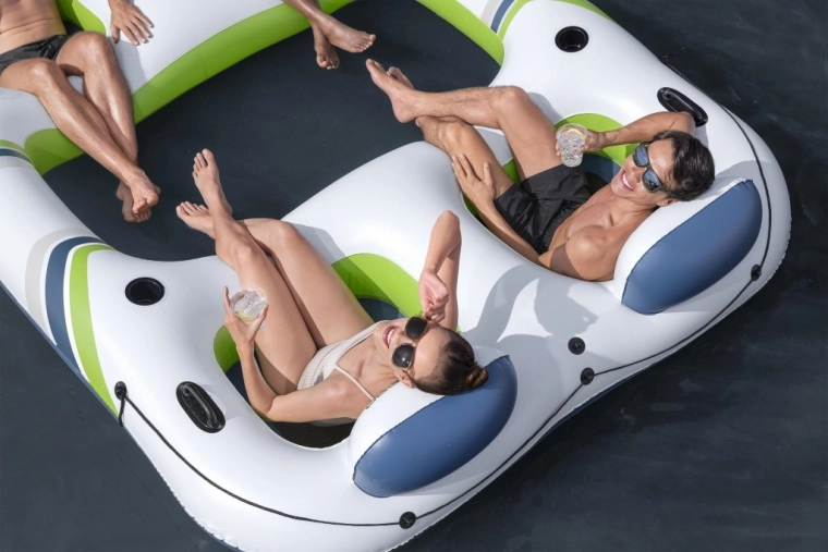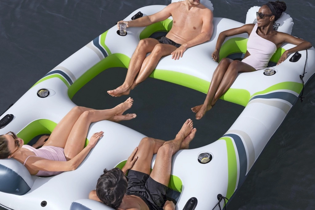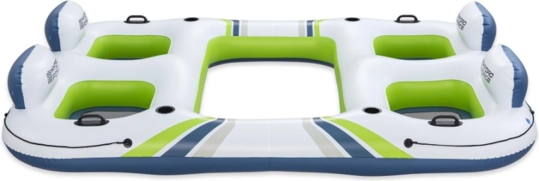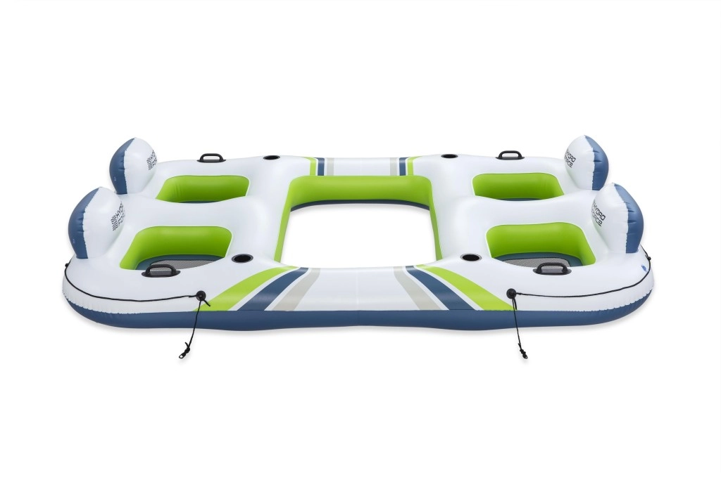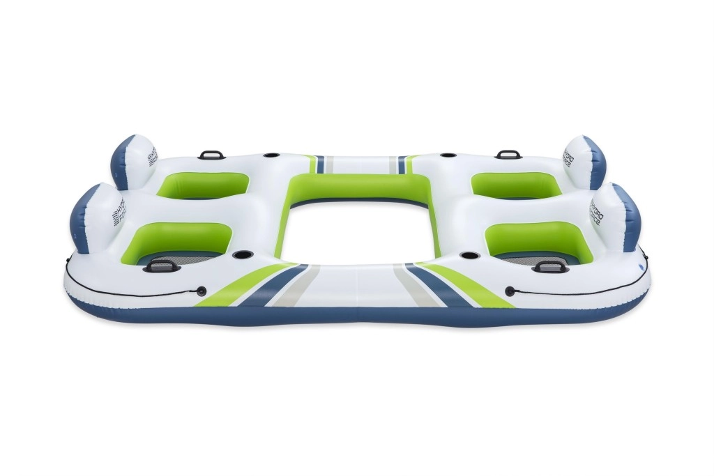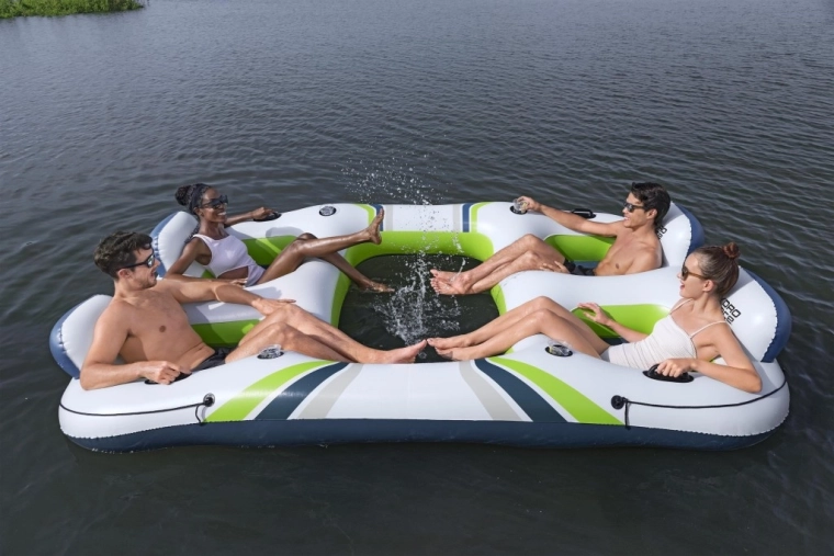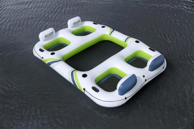 Ciesz się doskonałym relaksem na wodzie z przestronną wyspą dla czterech osób. Dzięki materiałowi Inflata‑Shield™ oferuje wyższą odporność na przebicia, sztywną konstrukcję i znakomite utrzymanie powietrza. Cztery wyściełane oparcia, siatkowe siedziska do chłodzenia nóg, uchwyty na napoje oraz praktyczne rączki zapewniają wygodę i bezpieczeństwo. System Clasp ’N Go™ umożliwia łatwe łączenie z innymi pływakami. Udźwig do 400 kg.