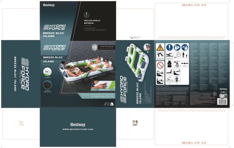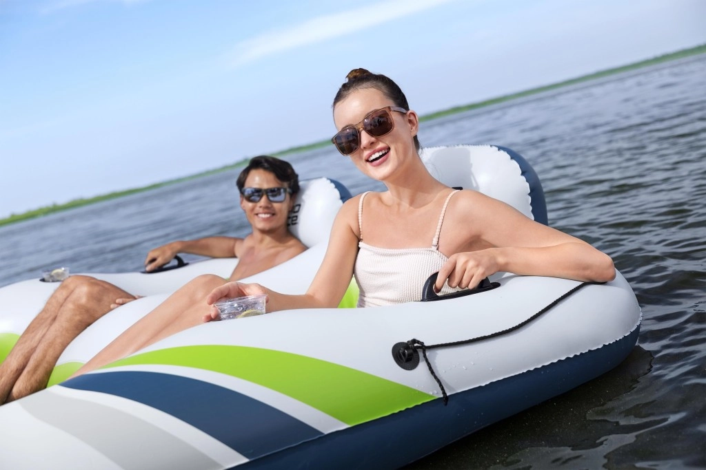 Trwała powłoka Inflata‑Shield™ minimalizuje ryzyko rozerwania i zwiększa sztywność całej konstrukcji. Szybkozamykane zawory przyspieszają pompowanie i spuszczanie powietrza, a cztery zintegrowane uchwyty na napoje trzymają Twoje orzeźwienie zawsze pod ręką. Dwa konektory Clasp ’N Go™ pozwalają połączyć wyspę z innymi pływakami i stworzyć większą strefę relaksu na wodzie.