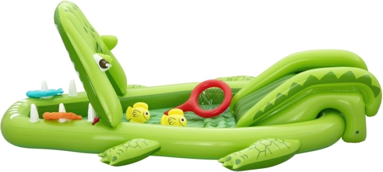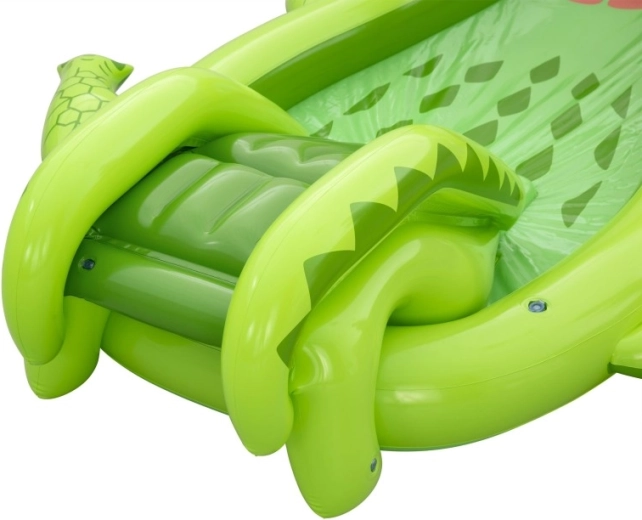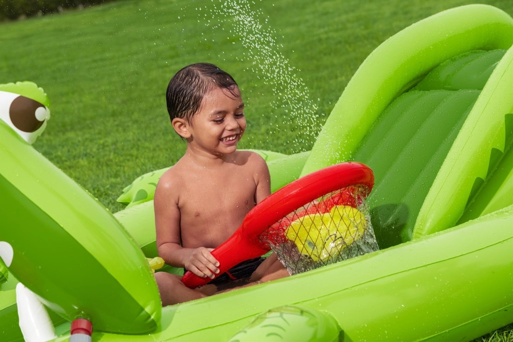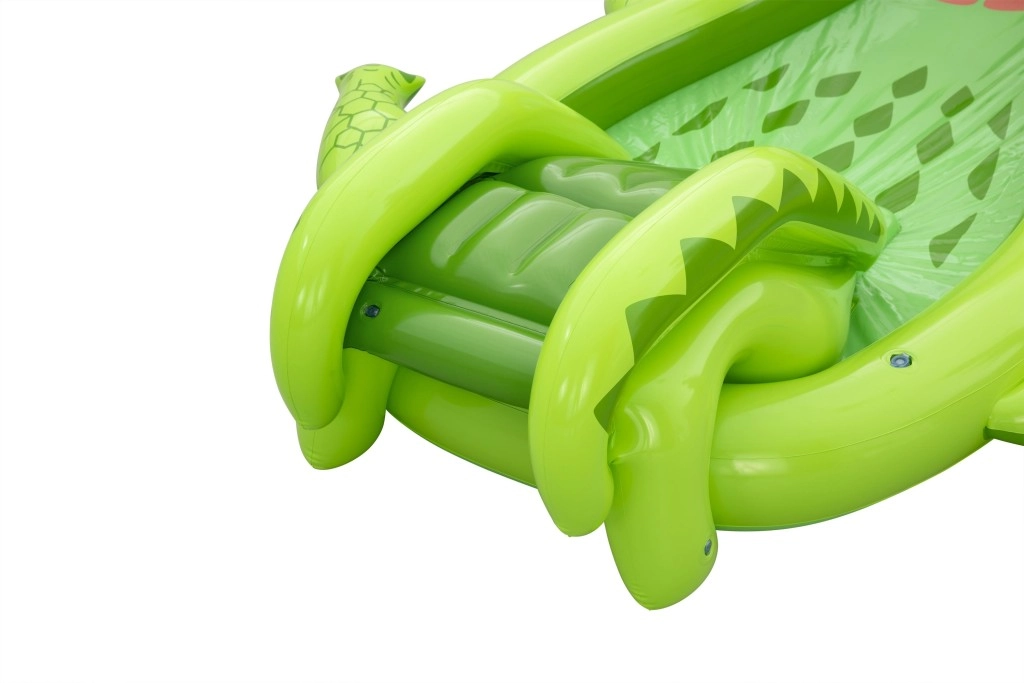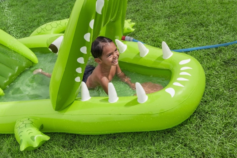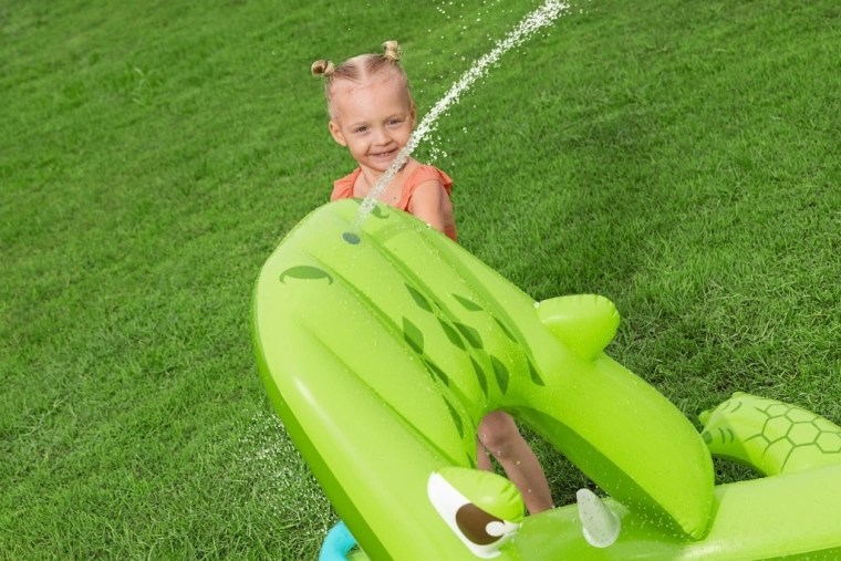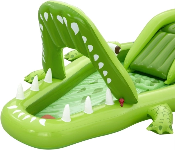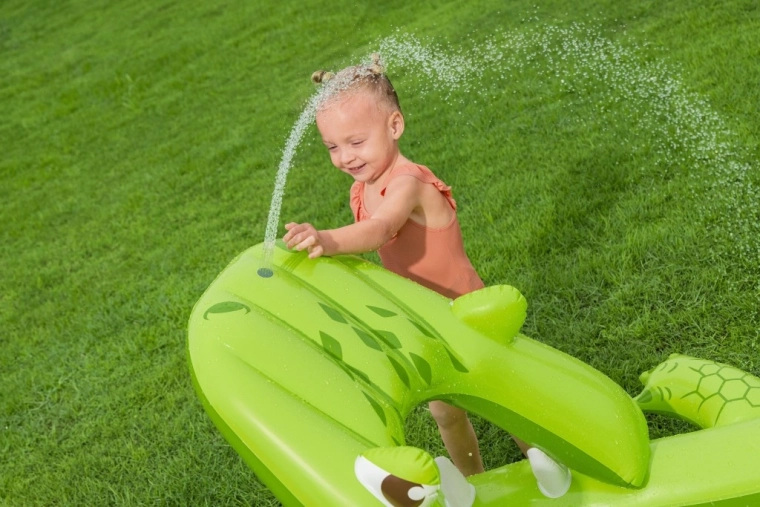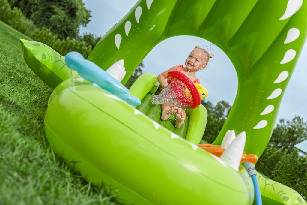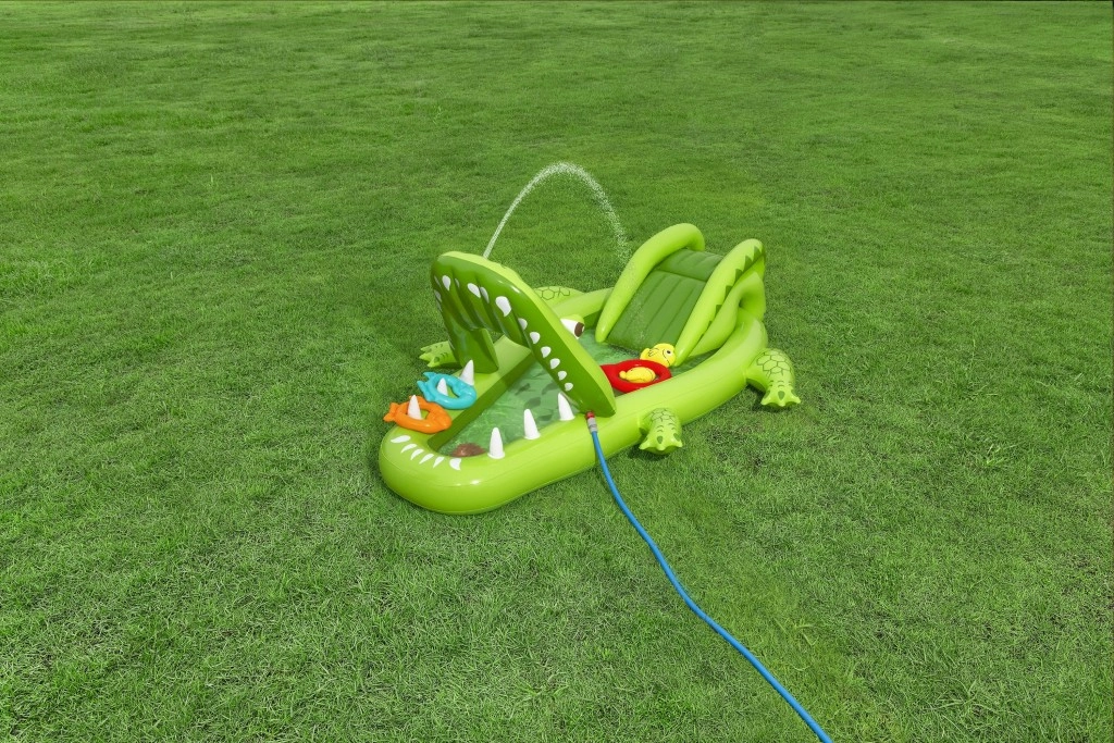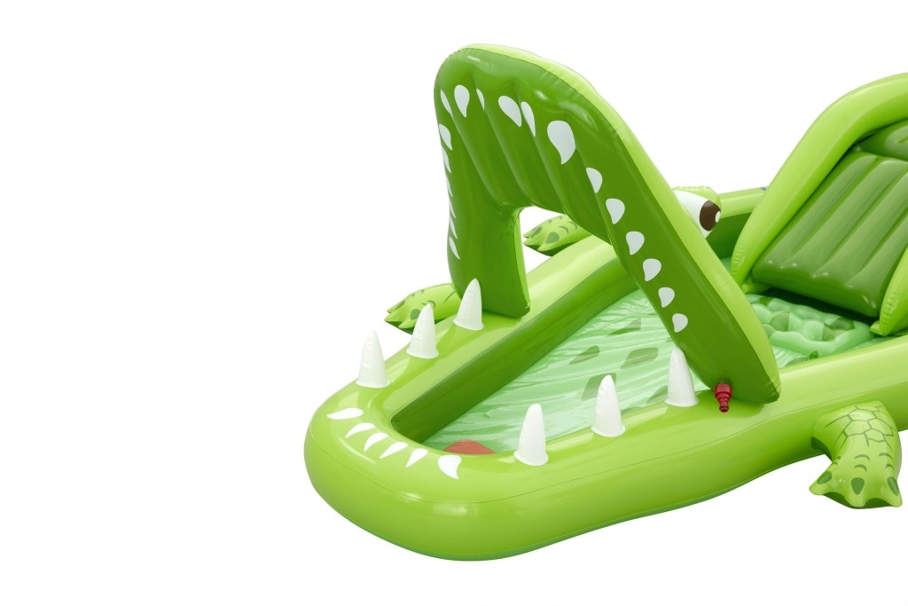 To nadmuchiwane centrum zabaw w kształcie aligatora zapewnia dzieciom godziny aktywnej rozrywki w ogrodzie. Realistyczny design z „paszczą–bramą” zachęca do zabawy, czołgania się i zjeżdżania, a wodny zraszacz podłączany do węża ogrodowego tworzy delikatny prysznic skierowany na zjeżdżalnię dla lepszego poślizgu i ochłody.